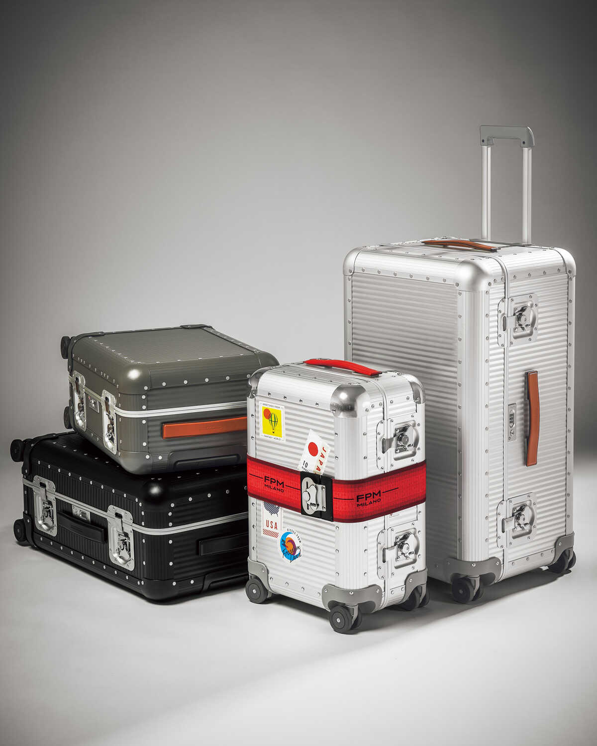 ヴィンテージトランクの趣に現代的なスタイルと機能を融合した人気の“バンク コレクション”。堅牢なアルミニウムにイタリアの職人による手作業で打ち込まれた128個のリベットが特徴。新作のレザーハンドルやエラスティックベルトなど、様々なカスタマイズも楽しめるようになって、ますます進化。右:“トランクオンウィールズ”W42.5×H75.5×D36.5㎝ 41万3600円 中:カスタマイズした“バンクS スピナー53”W36×H53×D24.5㎝ 23万7600円、エラスティックベルト1万9800円、イタリアンレザーのハンドル1万9800円 左上:“バンク スピナー55M”W40×H55×D24.5㎝ 33万2200円 左下:“バンク スピナー68”W45×H68×D27.5㎝ 36万6300円(以上エフピーエム ミラノ/エフピーエム ミラノ ショールーム)
