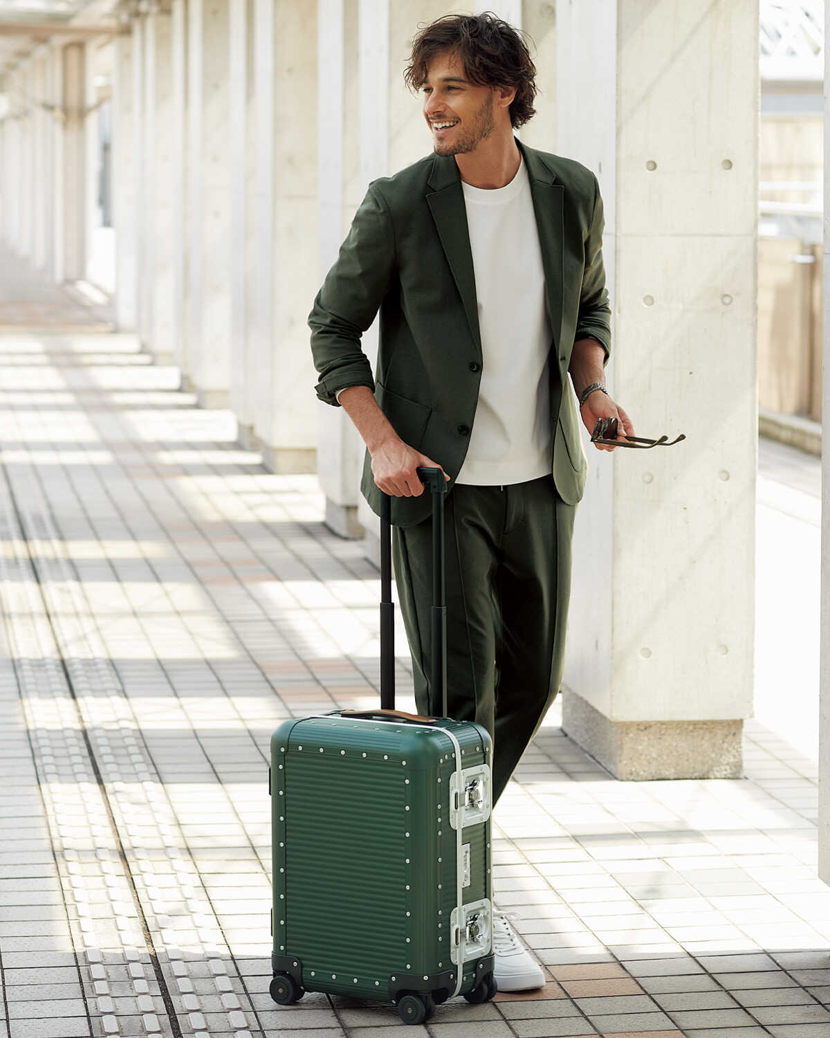 トロリー“バンク スピナー55M”W40×H55×D24.5㎝ 33万2200円(エフピーエム ミラノ/エフピーエム ミラノ ショールーム)、ジャケット4万9500円、カットソー1万1000円、パンツ2万2000円(以上アウール/アウール 阪急メンズ東京)、シューズ2万6400円(デバイス1/アウール 阪急メンズ東京)、その他はスタイリスト私物