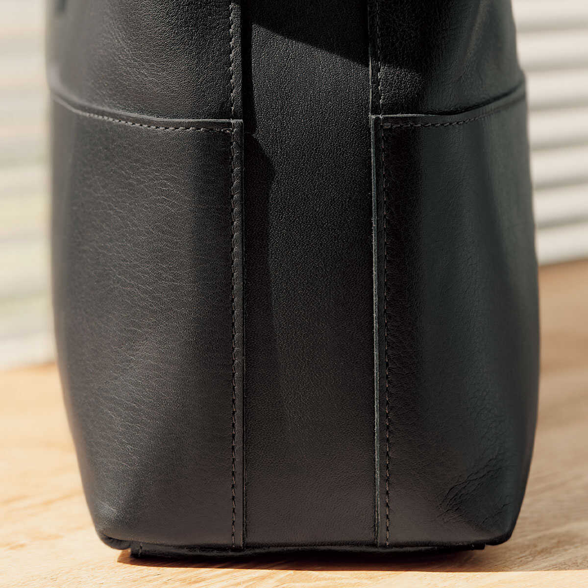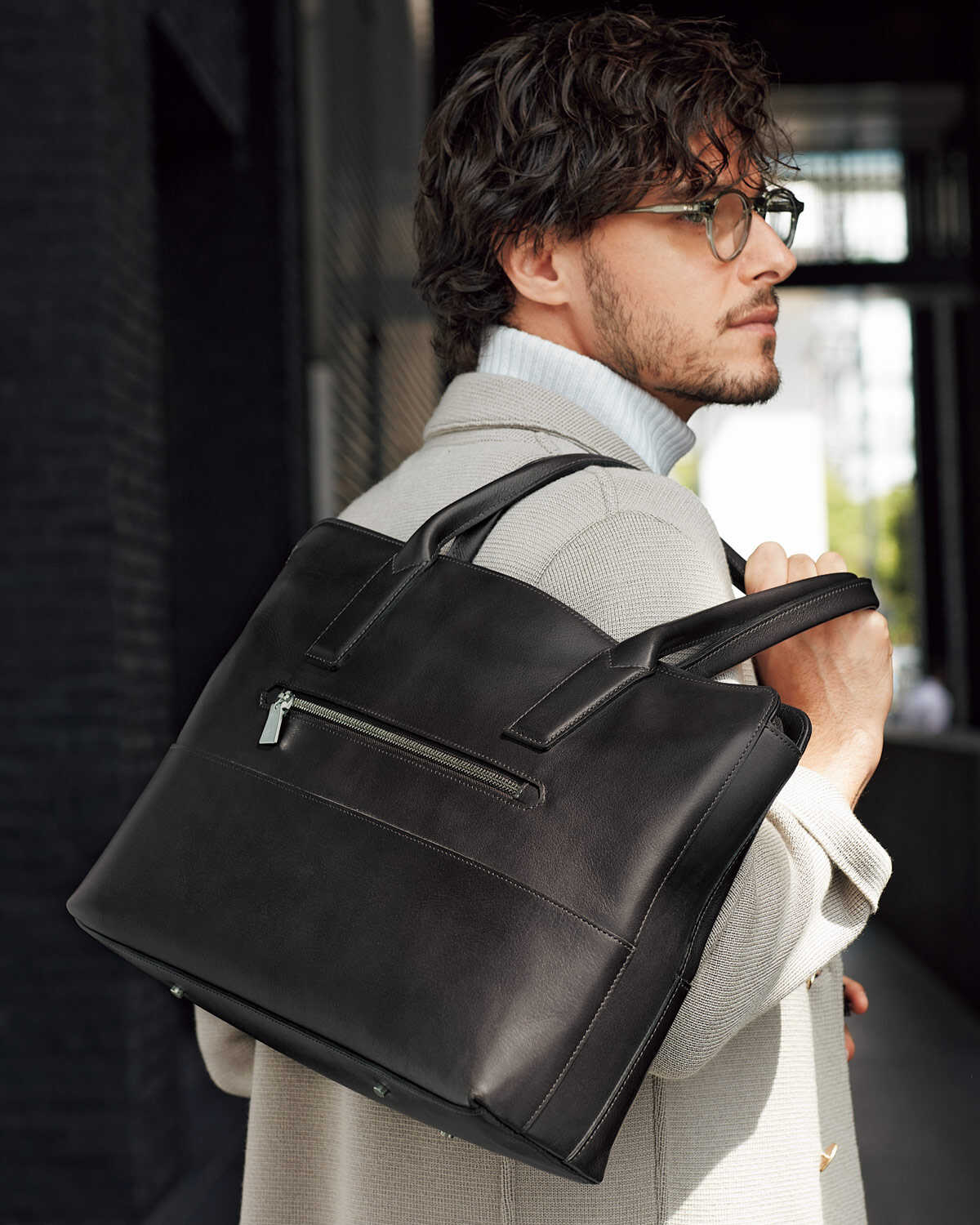 〈アニアリ〉の“アルティザンレザー”は、ブランドの技術を注ぎ込んだ特別なレザー。ベジタブルタンニンとクロームなめしを絶妙に組み合わせ、職人が1枚ずつ磨き上げることで、手に吸いつくような艶と質感を実現。その後、3度にわたる染色で深みのある高級感もプラス。このトートバッグは、PCも入る通勤にピッタリのサイズ感。ストラップは手持ちも肩がけも快適。W37.5×H29×D11㎝。4万9500円(アニアリ/プルーム)