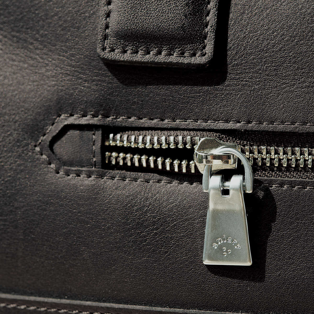 ファスナーの端をレザーで覆うことですっきりし、スマートな印象に