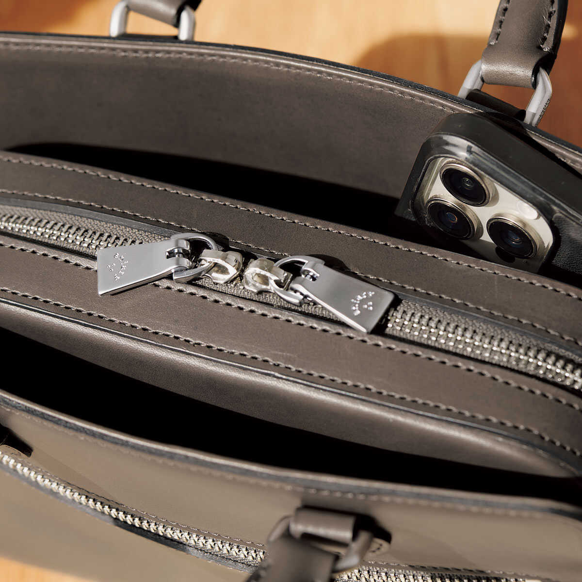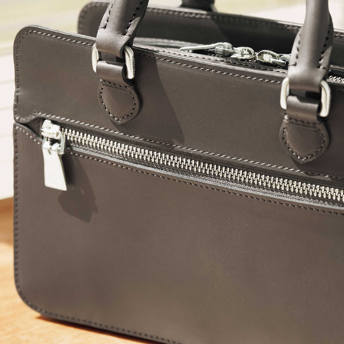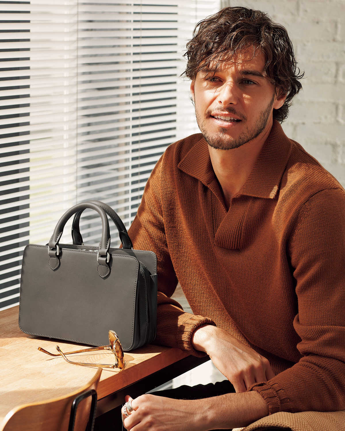 〈アニアリ〉から待望のミニブリーフが登場。豊岡製ハンドルで握りやすく、広めのマチで収納力も十分でまさに休日にピッタリ。「第3のなめし」と呼ばれるゼオライトレザーは、天然鉱物ゼオライトを使った環境負荷の少ない新技法を採用。北米産の上質な牛革を自然乾燥させ、顔料を使わず染料で仕上げており、なめらかな手触りと自然なムラ感を実現。W25×H17×D8㎝。4万2900円(アニアリ/プルーム)