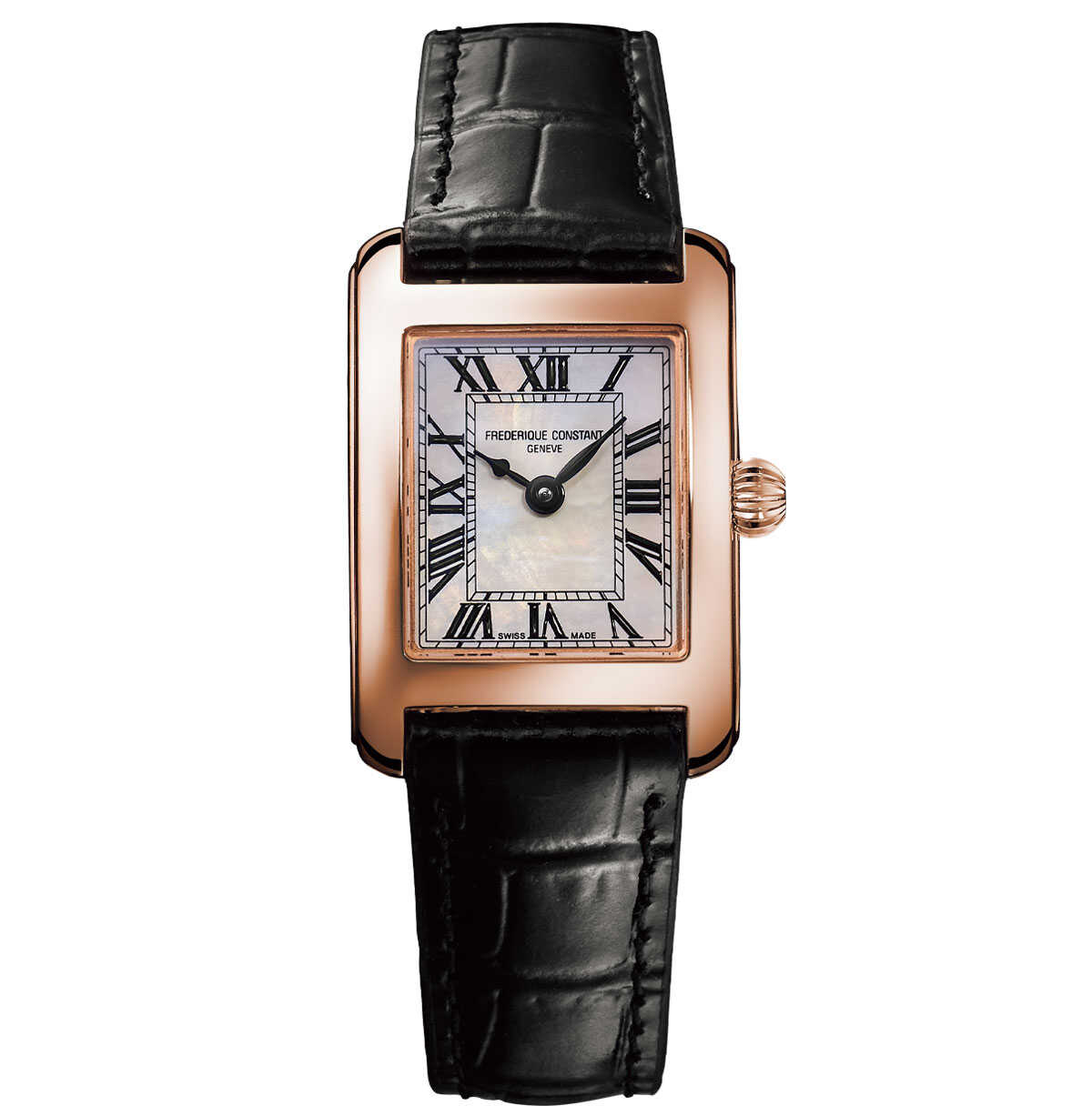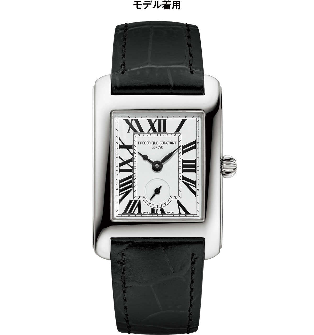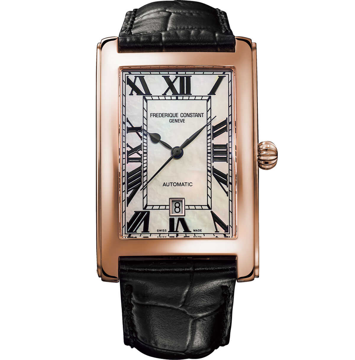 マザーオブパール文字盤と大胆なローマンインデックスが目を引くが、SSケースであくまでさりげない主張がスーツ姿にもよく似合う。日本限定モデル。ケースサイズ38.7×30.7㎜、自動巻き、 SSケース、牛革ストラップ、3気圧防水。28万6000円(フレデリック・コンスタント/フレデリック・コンスタント相談室)