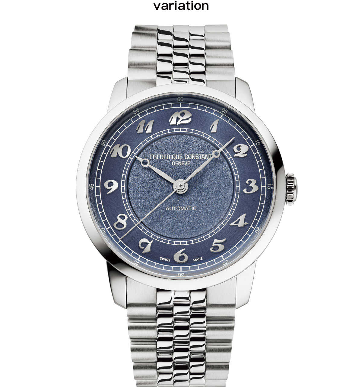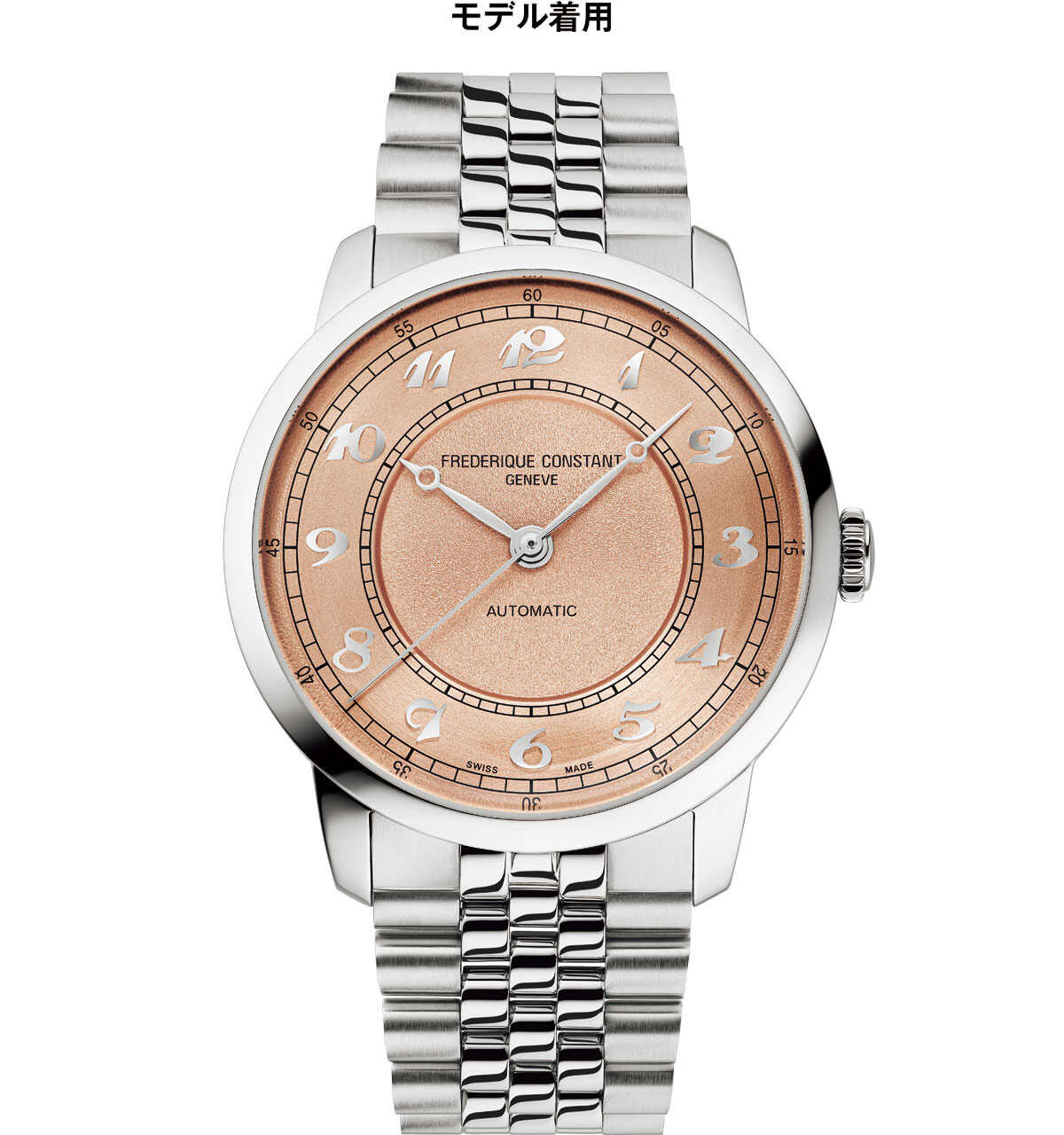小振りなケースに5つの半円形リンクブレスレットを合わせたモデル。アラビア数字のインデックスとブレゲ針がビンテージ時計の雰囲気を醸し出し、レイルウェイのミニッツトラックがアールデコを彷彿させる。縁に向かって膨らむボンベダイヤルの中央は一段下げてマットなグレイン加工を、まわりはソレイユ装飾を施している。68時間のパワーリザーブで実用性も十分。ケース径38.5㎜、自動巻き、SSケース&ブレス、5気圧防水。各36万3000円(以上フレデリック・コンスタント/フレデリック・コンスタント相談室)