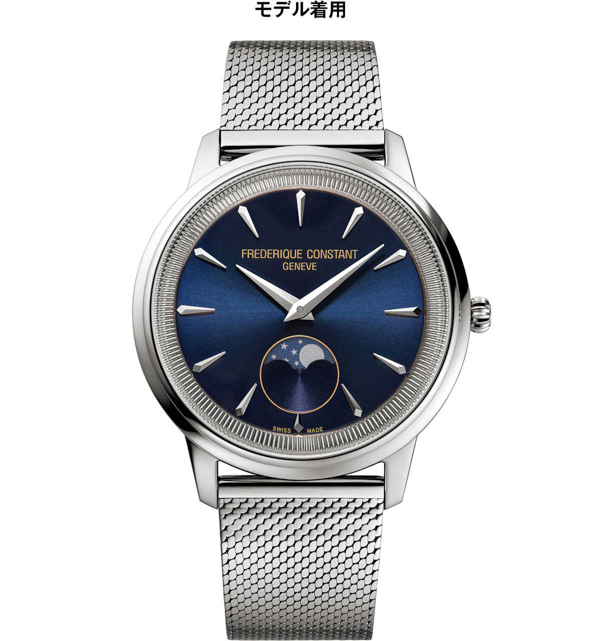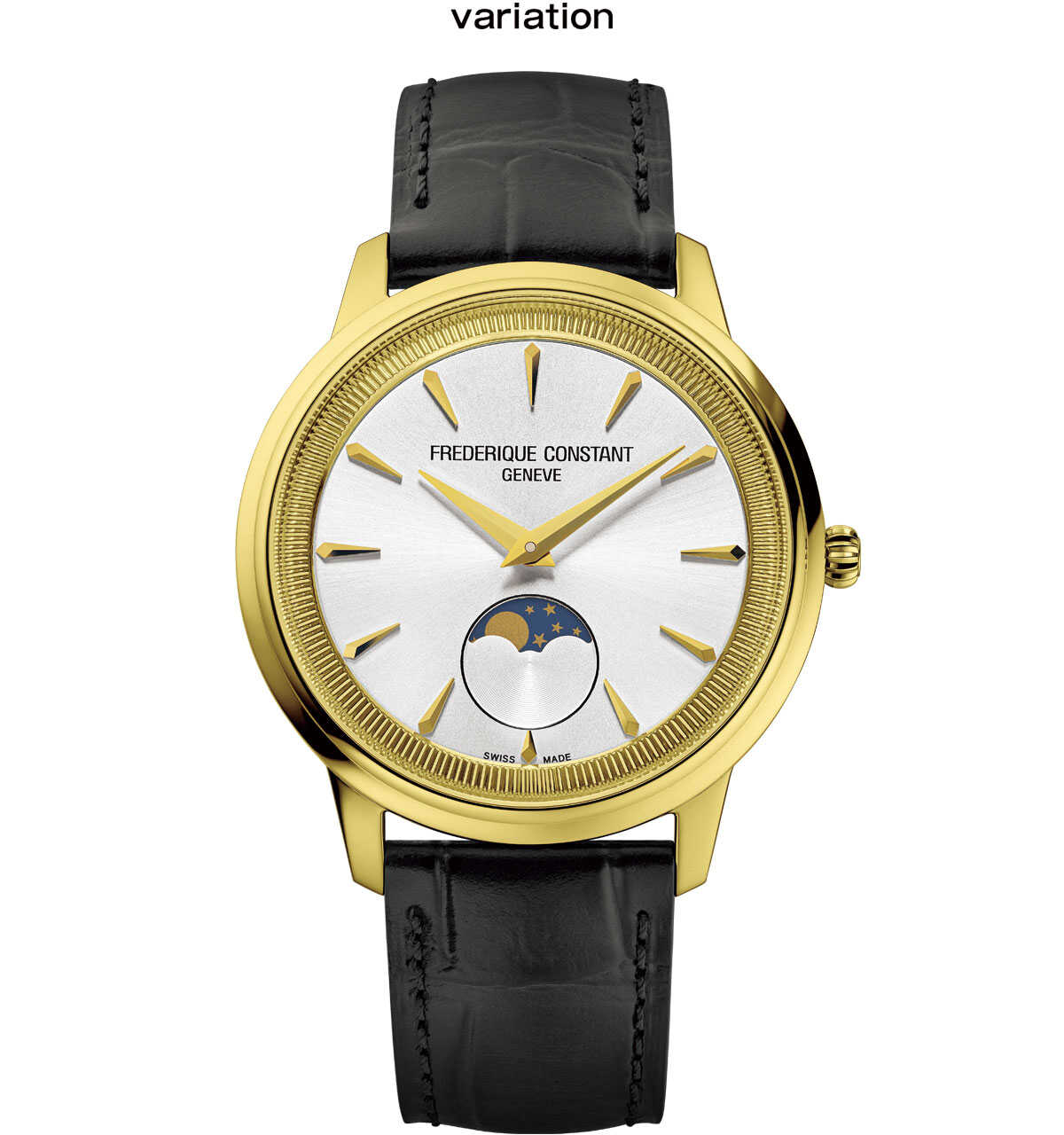 ムーンフェイズを搭載し、文字盤は繊細なソレイユ装飾。アプライドインデックスや職人の手作業で研磨されたドルフィン針とともに、こだわりを演出する。写真1枚め:ケース径37㎜、クォーツ、SSケース&ブレス、5気圧防水。22万円(フレデリック・コンスタント/フレデリック・コンスタント相談室) 写真2枚め:ケース径37㎜、クォーツ、SS×YGプレートケース、牛革ストラップ、5気圧防水。22万円(フレデリック・コンスタント/フレデリック・コンスタント相談室)