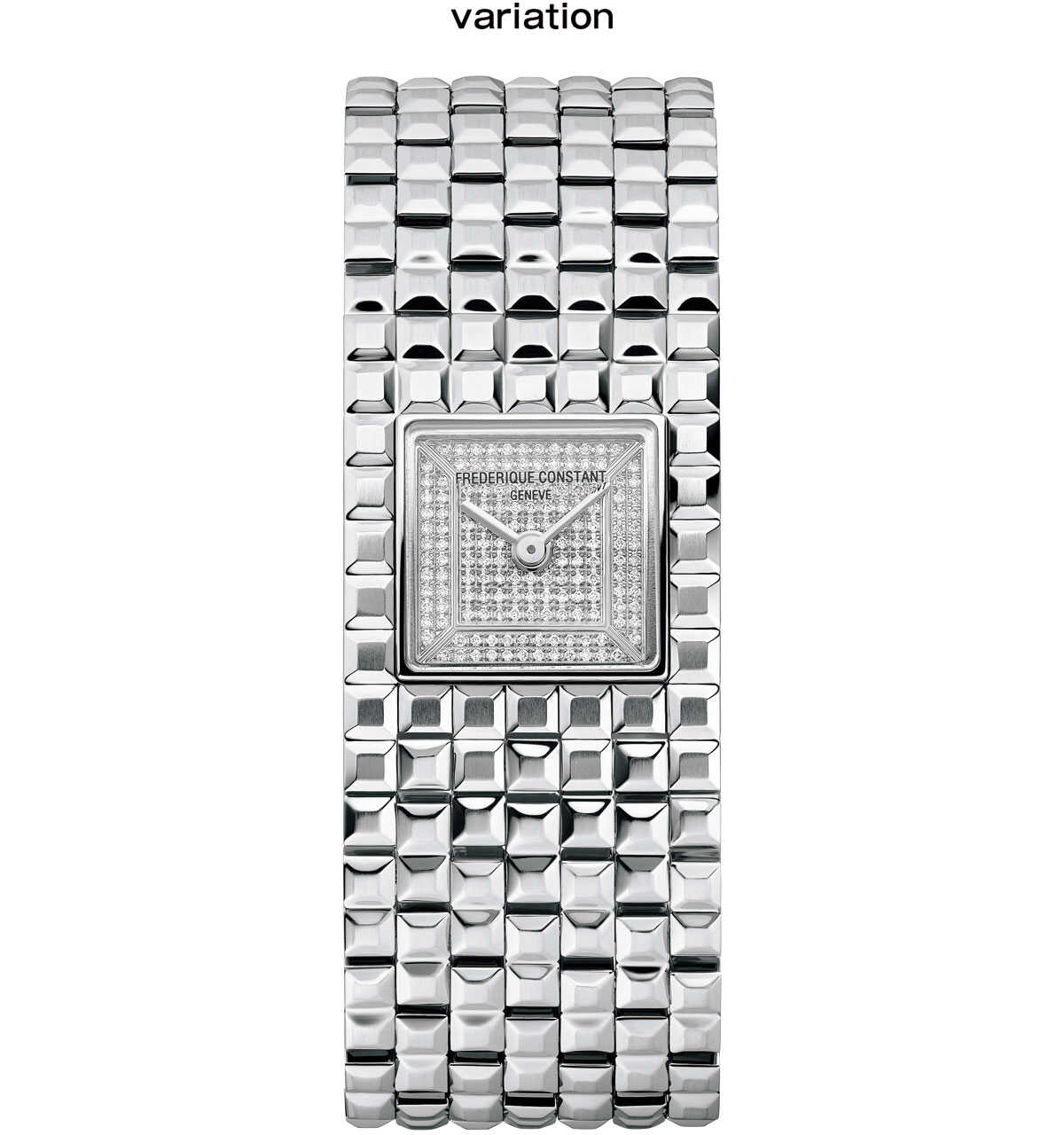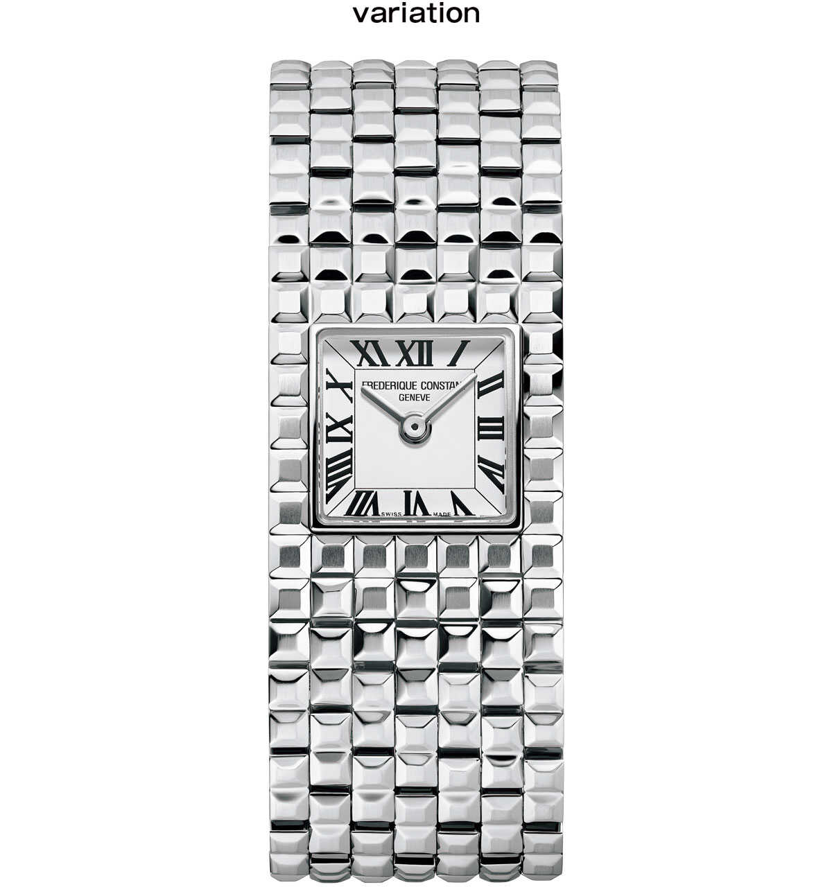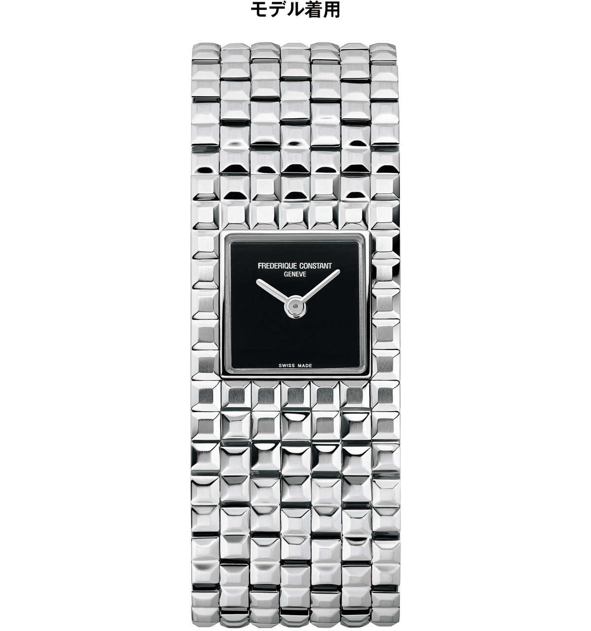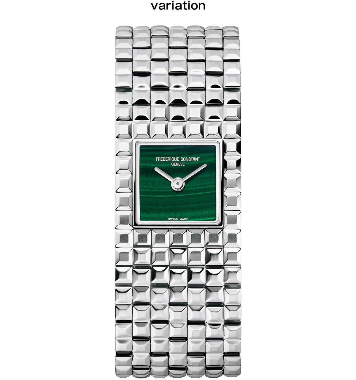 “クル・ド・パリ”を表現した7つのスクエアリンクのブレスと文字盤を一体化したカフウォッチ。写真1枚め:オニキス文字盤。ケースサイズ25.7×20㎜、クォーツ、SSケース&ブレス、3気圧防水。33万円(フレデリック・コンスタント/フレデリック・コンスタント相談室) 写真2枚め:文字盤にダイヤモンド158石。ケースサイズ25.7×20㎜、クォーツ、SSケース&ブレス、3気圧防水。71万5000円(フレデリック・コンスタント/フレデリック・コンスタント相談室) 写真3枚め:マラカイト文字盤。ケースサイズ25.7×20㎜、クォーツ、SSケース&ブレス、3気圧防水。33万円(フレデリック・コンスタント/フレデリック・コンスタント相談室) 写真4枚め:ケースサイズ25.7×20㎜、クォーツ、SSケース&ブレス、3気圧防水。24万2000円(フレデリック・コンスタント/フレデリック・コンスタント相談室)