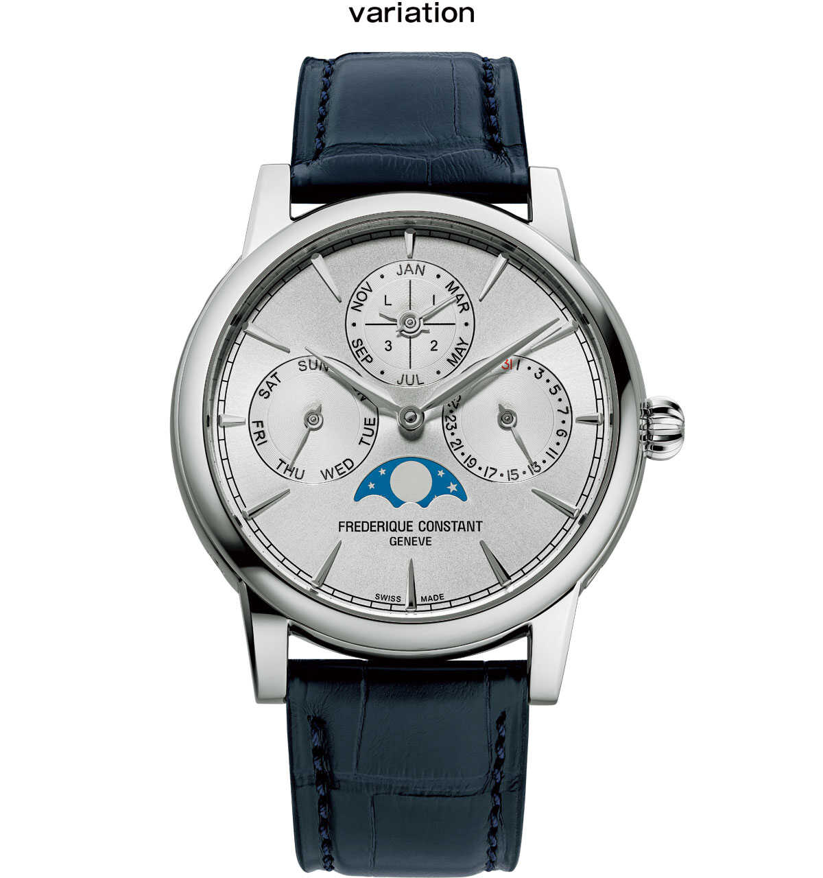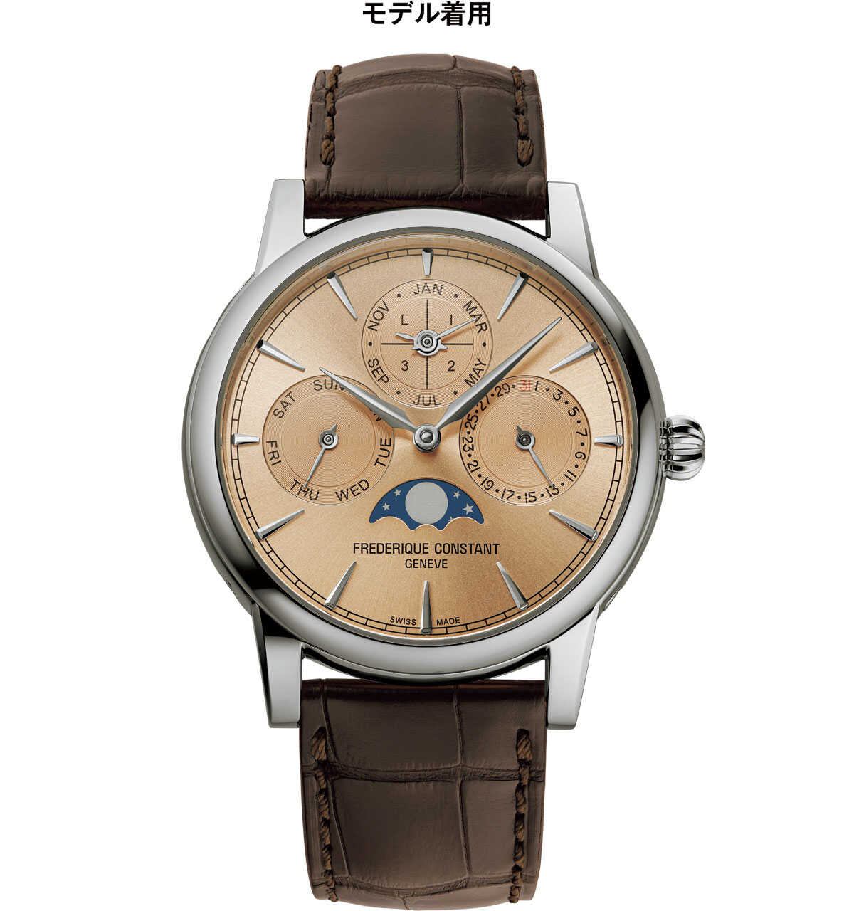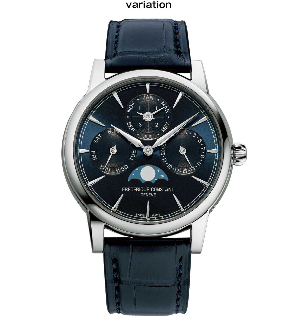最高峰のマニュファクチュールと評される三大複雑機構のひとつ、パーペチュアルカレンダーを搭載。さらにはムーンフェイズも備え、時計好きにとって、ロマンがあふれるコンプリケーションウォッチだ。日付や曜日、月、閏年、ムーンフェイズといった表示がプッシュボタンで設定可能。自社製ムーブメント“FC-776キャリバー”でパワーリザーブは72時間。メタリックなサンレイ仕上げのダイヤルカラーは3色展開で、自分らしいカラーを選ぶ楽しみがあるのも嬉しい。ケース径40㎜、自動巻き、SSケース、アリゲーターストラップ、5気圧防水。各176万円(以上フレデリック・コンスタント/フレデリック・コンスタント相談室)