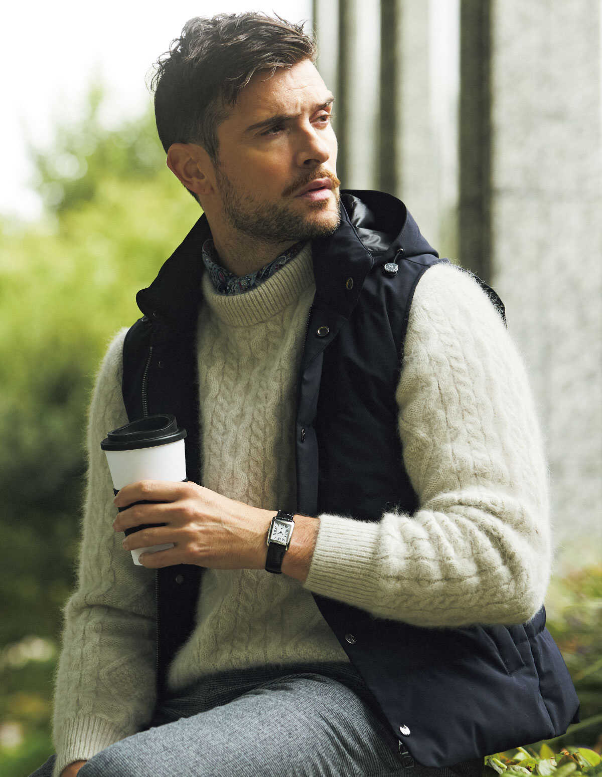 ダウンベスト13万7500円(モンテコーレ/阪急メンズ東京 サードスタイル)、ニット6万4900円(レンコントラント/阪急メンズ東京 サードスタイル)、パンツ4万8400円(ジーティーアー/阪急メンズ東京 サードスタイル)、その他はスタイリスト私物