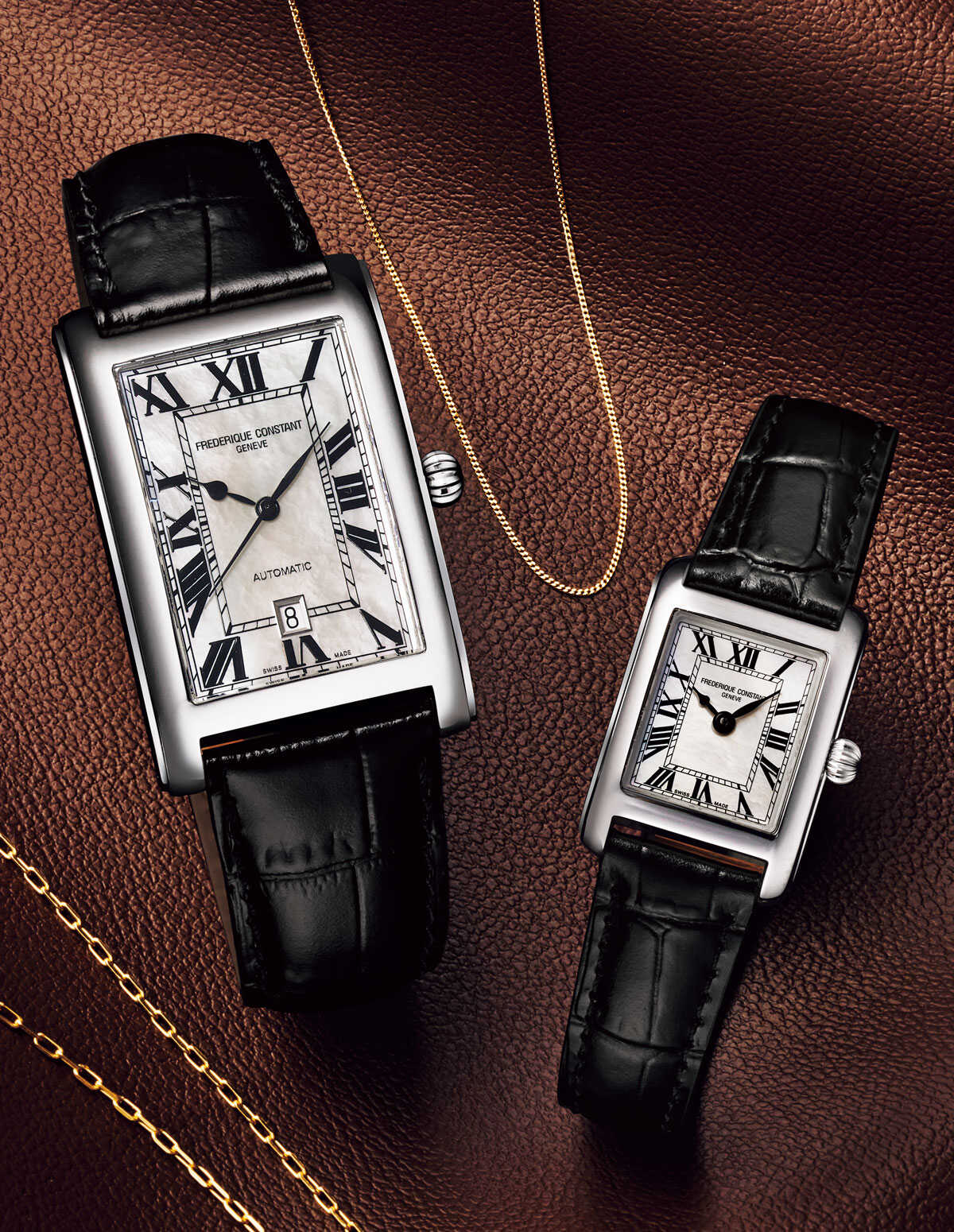 ポリッシュ仕上げのSSケースが放つスマートな輝きに、幻想的なマザーオブパールのダイヤルを合わせることで、独特のエレガンスをまとう。パートナーとペアで身につけたい。日本限定モデル。右:ケースサイズ23×21㎜、クォーツ、SSケース、牛革ストラップ、3気圧防水。18万1500円(フレデリック・コンスタント/フレデリック・コンスタント相談室) 左:ケースサイズ38.7×30.7㎜、自動巻き、SSケース、牛革ストラップ、3気圧防水。28万6000円(フレデリック・コンスタント/フレデリック・コンスタント相談室)