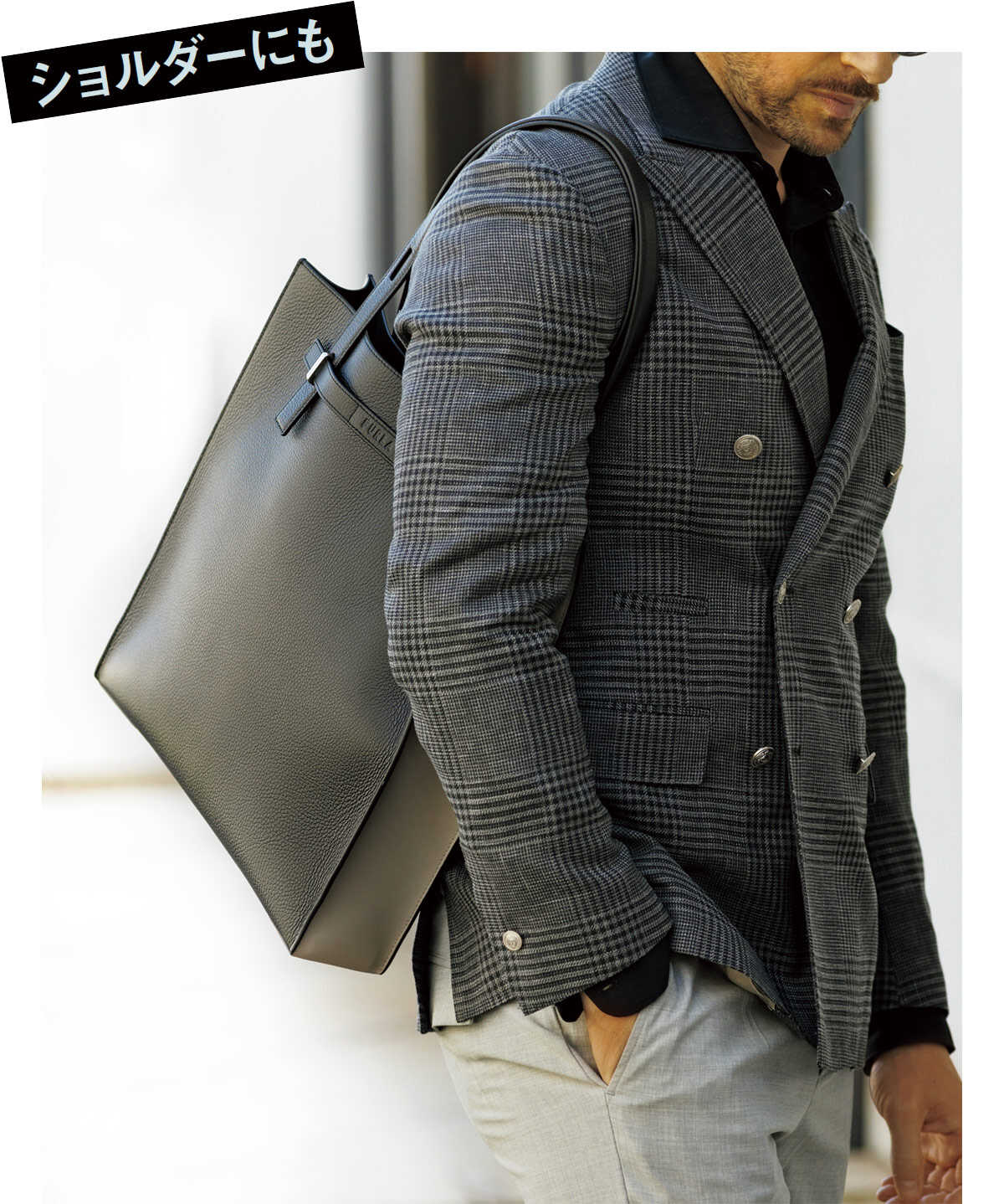ショルダーを外せばクラッチとしても使える薄型バッグ。写真のようにラフに持つだけで、大人の余裕と美意識をさりげなく表現できる。また、バッグ自体が小ぶりで主張しすぎないデザインだからこそ、コーディネート全体をクラスアップしてくれる効果も。W29.5×H20.5×D5㎝。6万3800円(フルラ/フルラ ジャパン)