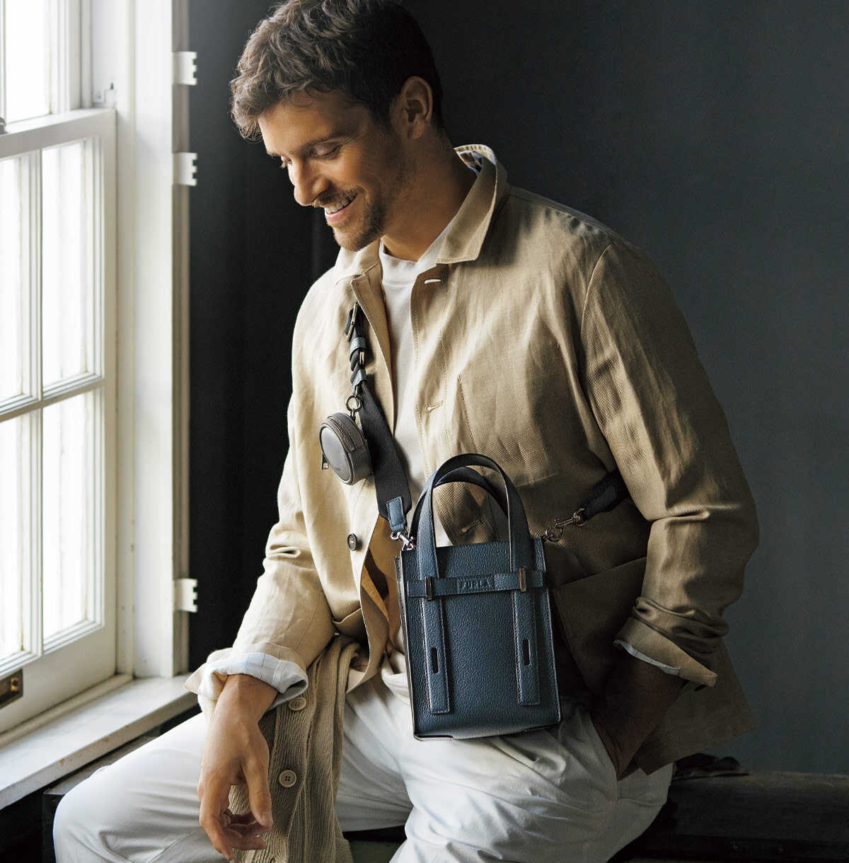 両手が自由で軽快に動けるクロスボディバッグは、休日の外出に最適な存在。このモデルはコンパクトながら、大人の一日にちょうどいい収納力を備える。すっきりとした縦のラインが装いに端正さを添え、丸みのある外付けイヤフォンケースが機能性と遊び心をさりげなく演出。W16×H20×D9㎝。6万2700円(フルラ/フルラ ジャパン)