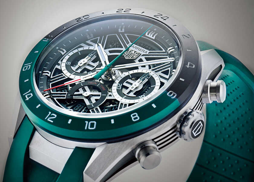 オープンワーク仕上げのGMT針を採用することで、視認性を向上。自社製新ムーブメント“TH20-02”は、約80時間のパワーリザーブを誇る。ケース径44㎜、自動巻き、チタンケース、ラバーストラップ、100m防水。予定価格135万8500円(タグ・ホイヤー/LVMHウォッチ・ジュエリー ジャパン タグ・ホイヤ一)