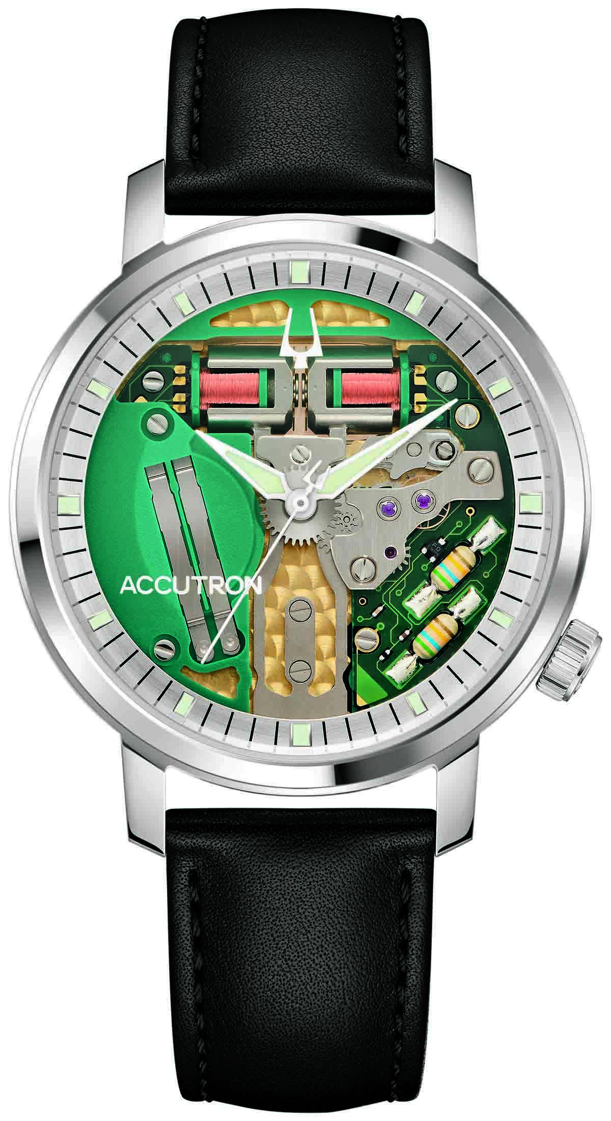スイープ運針の秒針も特徴的な“アキュトロン チューニングフォーク スペースビュー 314”。こだわりの音叉機構を含むムーブメントを表裏から眺められる。技術の複雑さゆえ、ムーブメントは100%手組み。ケース径39㎜、音叉、SSケース、牛革ストラップ、3気圧防水。99万円(アキュトロン/ブローバ相談室)