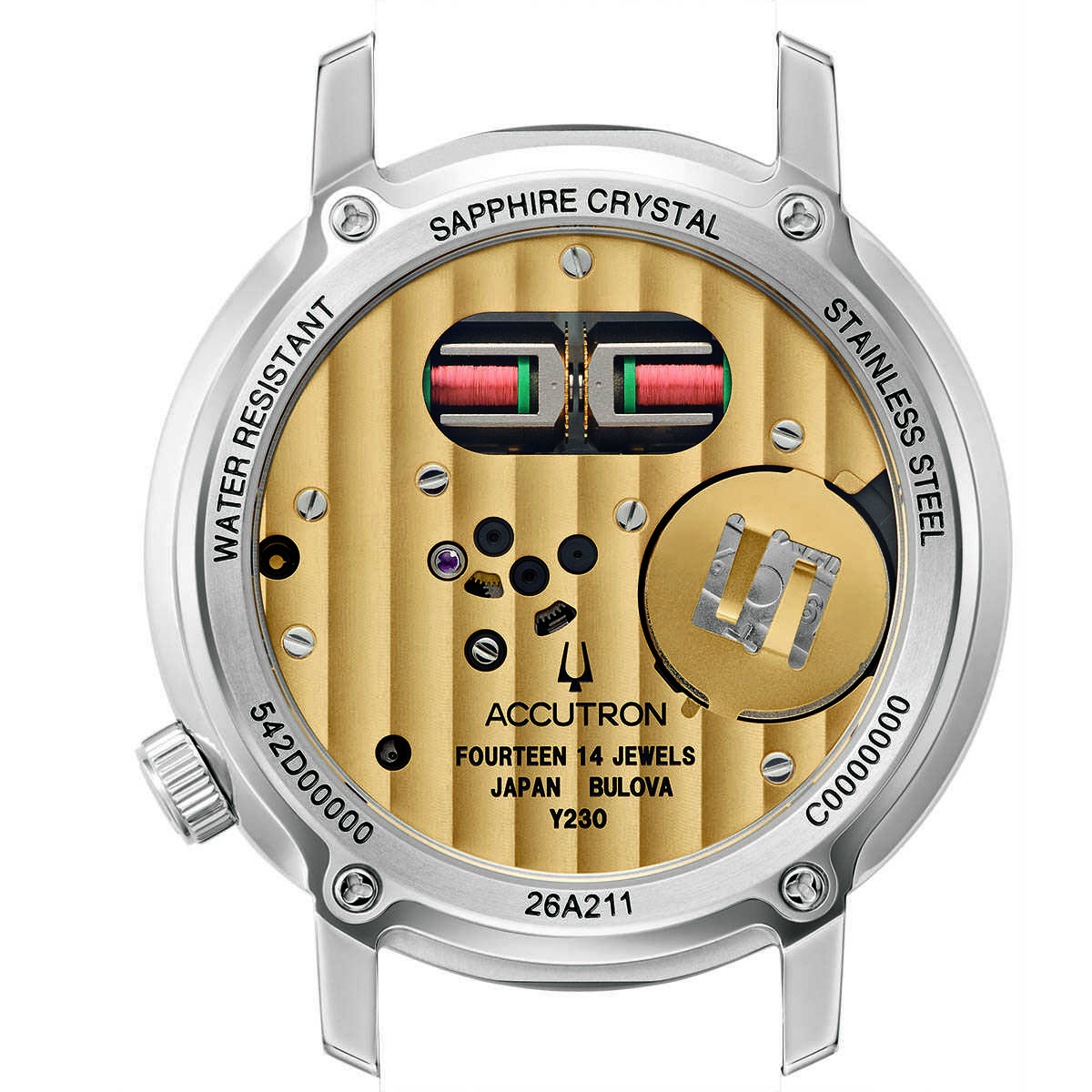 「まず知っていただきたいのは、なぜ〈アキュトロン〉の誕生がエポックメイキングだったかです。1960年代当時は、機械式時計が主流。そんな時代に音響装置の音叉にトランジスタの電気振動を用いて、高精度な計時機能を実現したのが〈アキュトロン〉でした。その精度の高さは当時の機械式時計を凌駕するもので、NASAのアポロ計画にこの計時装置が採用されたことが、評価の高さを物語っています。今回この技術を復活させたわけですが、決して簡単ではなかった。現代にない部品も多数ありましたが、妥協せず当時と変わらない魅力にこだわりました。注目してほしいのは音。音叉式電子時計は耳を近づけるとブーンという独特の音が聞こえますが、これもオリジナルと全く同じ360ヘルツです」