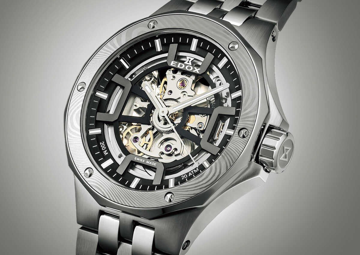 42時間のパワーリザーブを実現した自動巻きムーブメントCal. 853は、ケースバックからも眺められる。“デルフィン オリジナル メカノ オートマティック ダマスカス リミテッド エディション”。ケース径40㎜、自動巻き、SSケース&ブレス、200 m防水。473000円(エドックス/ジーエムインターナショナル)