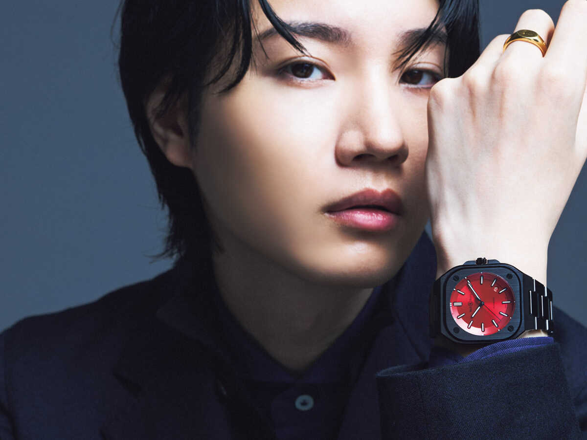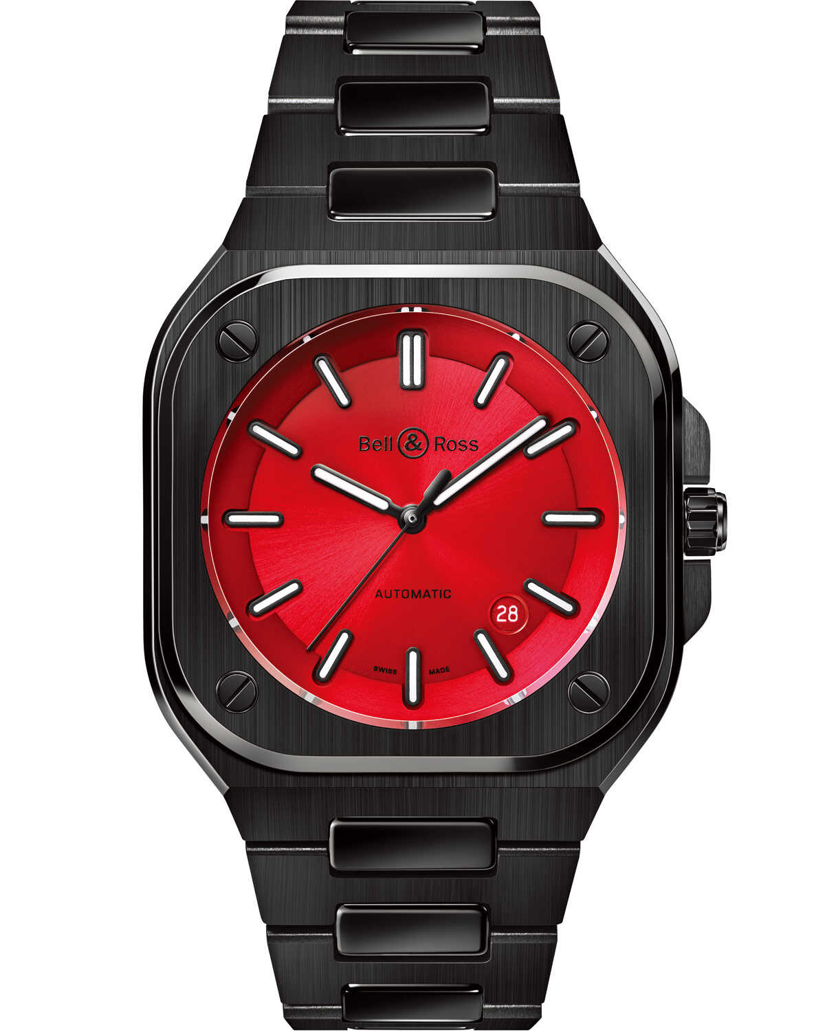 アイコニックな“四角の中に丸”のスタイルを都会的にアップデイトしたBR-05。その日本限定モデルはサンレイ仕上げの赤いダイヤルが鮮烈な印象を放つ。ケースとブレスレットには耐傷性に優れたブラックセラミックを採用。限定99本。ケース径41㎜、自動巻き、セラミックケース&ブレス、100ⅿ防水。117万7000円(ベル&ロス/ベル&ロス 銀座ブティック)
