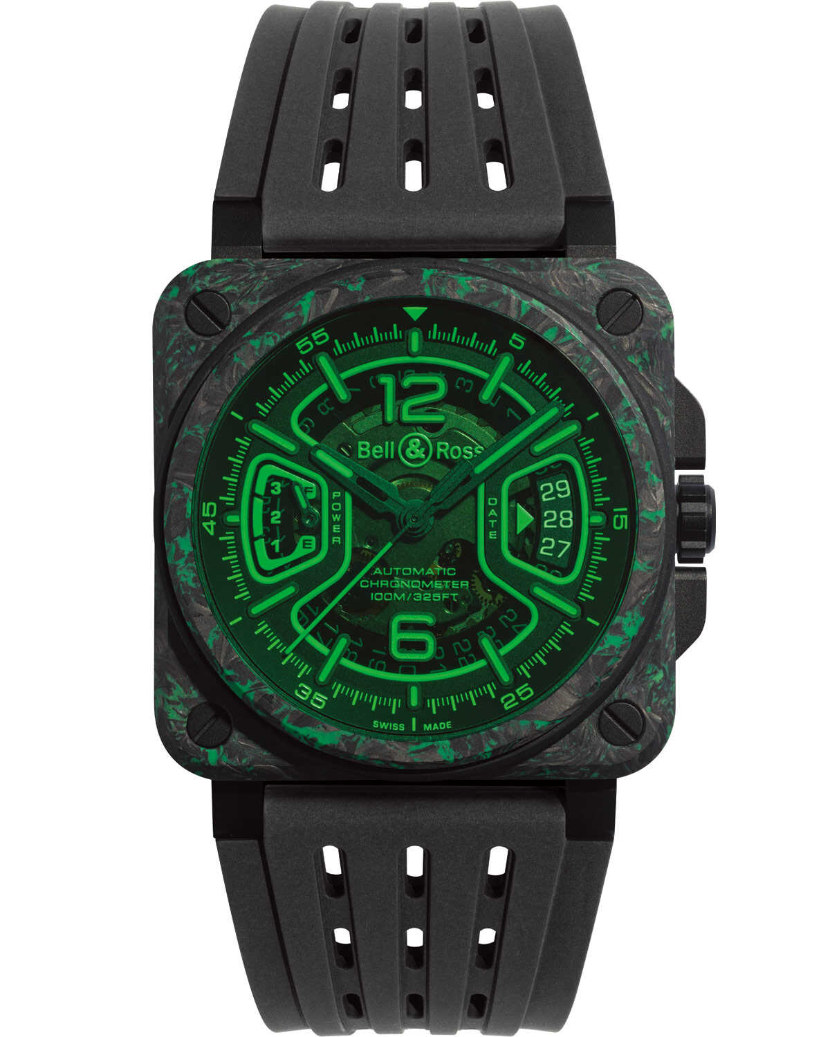 ブランドの象徴である航空計器を未来的な次元へと押し進めた限定作は、航空機のヘッドアップディスプレイに着想を得た蓄光が存在感を放つ。発光材が使われた多層構造ケース自体が光る革新的なデザインが特徴だ。世界限定250本。ケース径41㎜、自動巻き、チタン+蓄光カーボンケース、ラバーストラップ、100ⅿ防水。205万7000円(ベル&ロス/ベル&ロス 銀座ブティック)