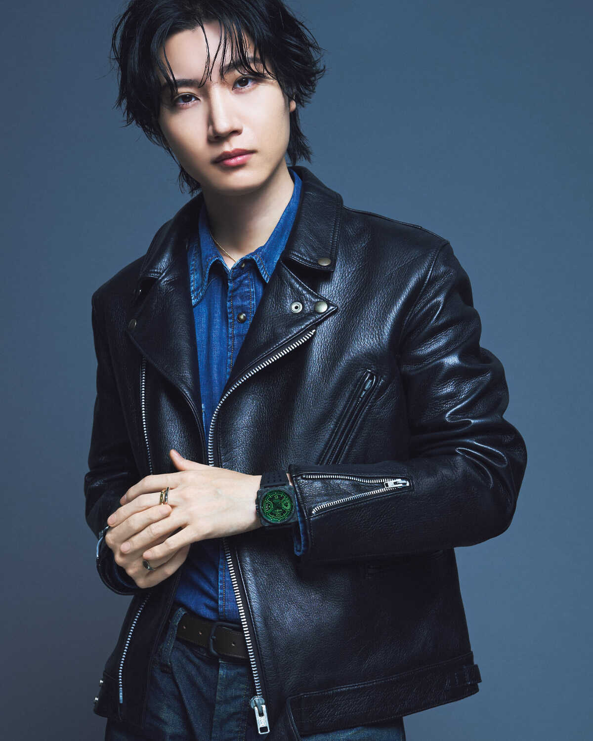 「僕は“理に適ったデザイン”が好きなんですが、この時計の蓄光にも視認性を高める、という明確な目的を感じます」。もともと宇宙や航空機に興味があるという桜田。コックピットのディスプレイにインスパイアされた緑の蓄光や計器のようなデザインがその心を掴んだ。「スケルトンダイヤルも好きなディテールです。ムーブメントをずっと眺めていたくなります」。着こなしは黒いダブルのライダースで。「レザーやデニムを使った、マスキュリンなスタイルの切り札として使いたい」
