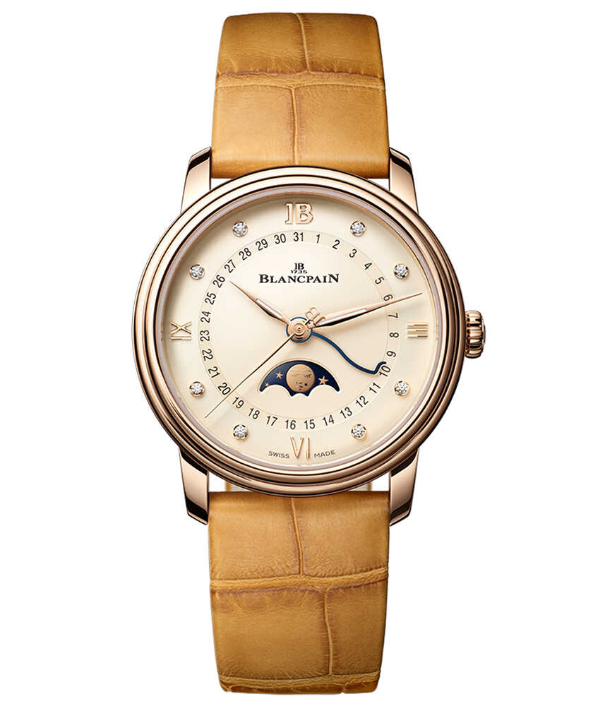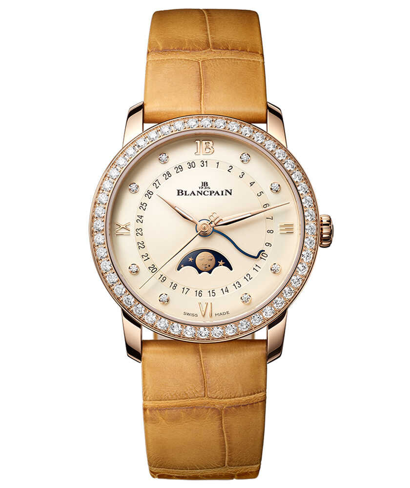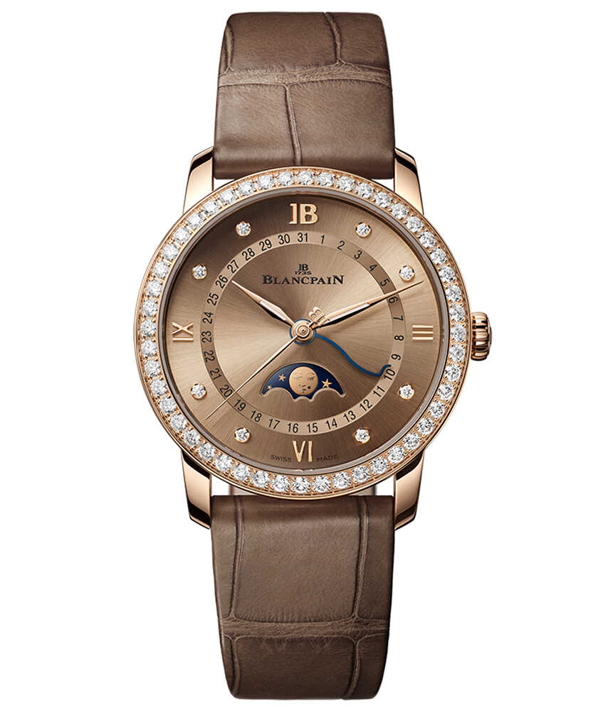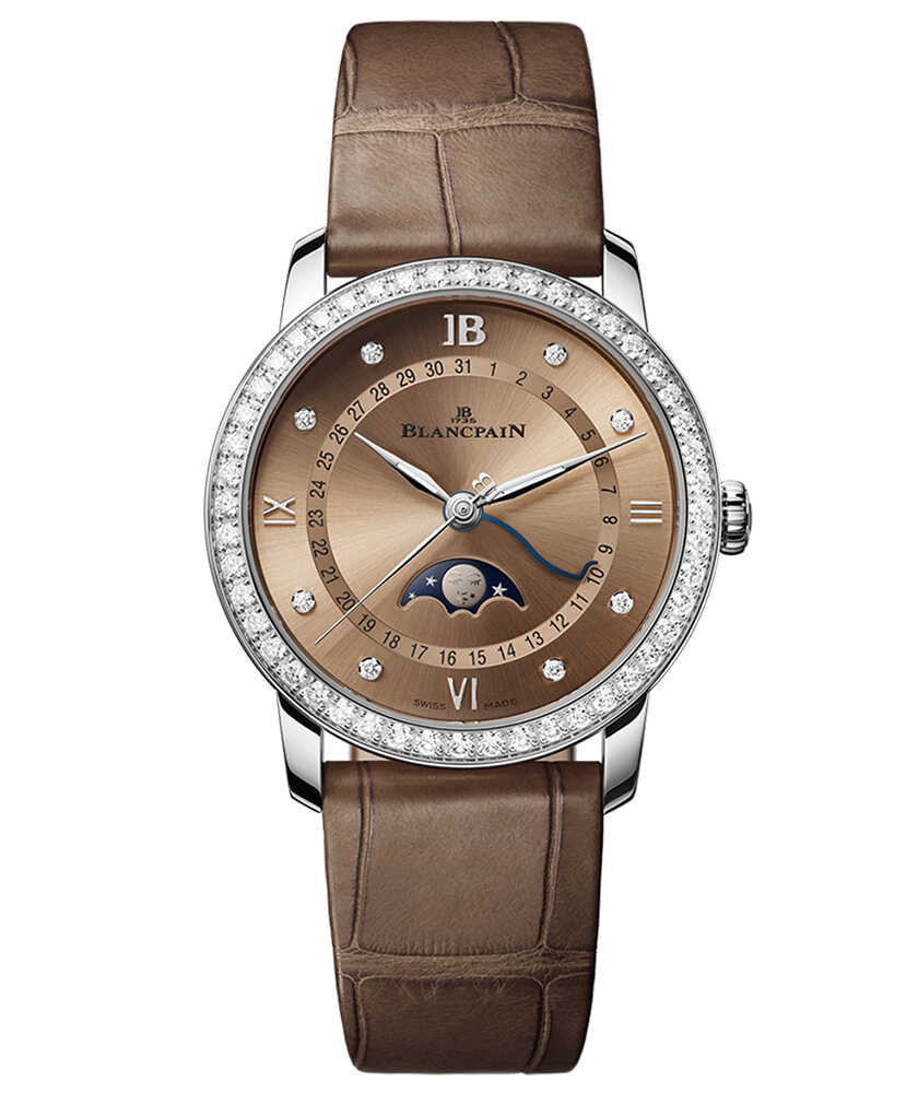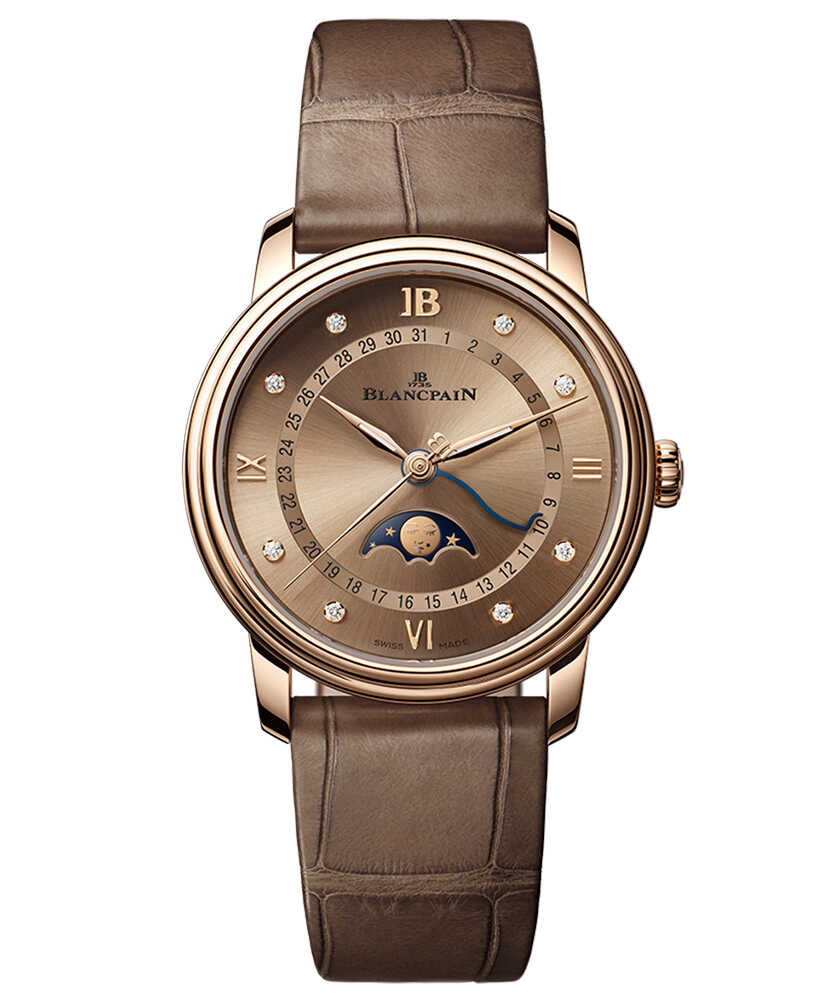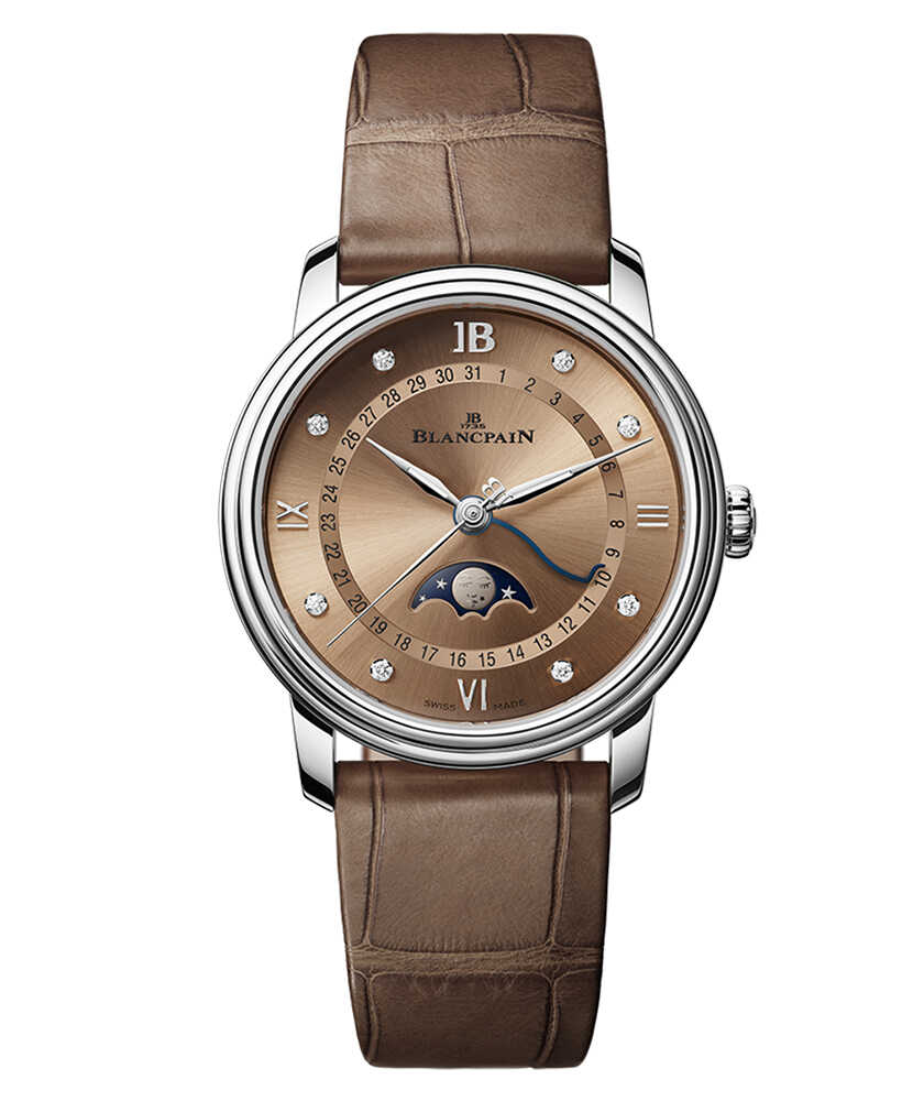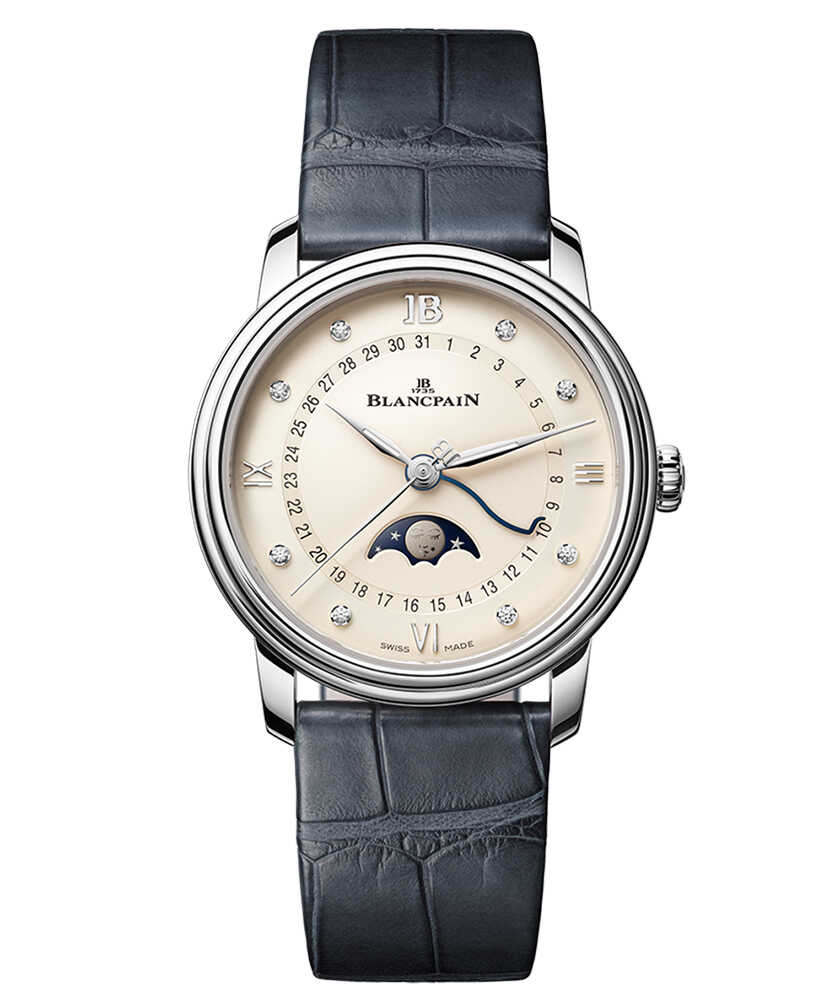 ブランパンマニュファクチュールキャリバー 913QL.Pを搭載。ケース径33.20㎜、自動巻き、18KRGまたはSSケース、ブルーグレー、ハニーまたはブラウンレザーストラップ(クイックチェンジシステム)、パワーリザーブ40時間、3気圧防水。SSケースモデル各192万5000円、18KRGモデル各322万3000円、SSケース+ダイヤモンドベゼル各272万8000円、18KRGケース+ダイヤモンドベゼル各405万9000円(以上ブランパン/ブランパン ブティック 銀座)