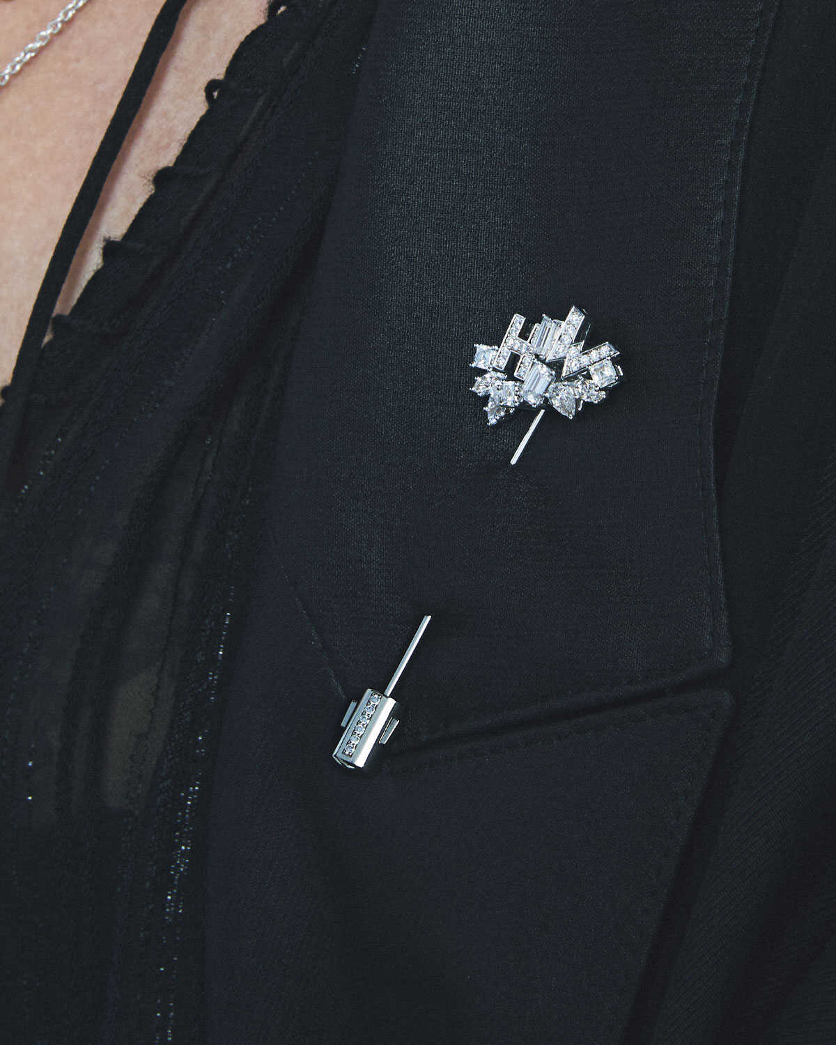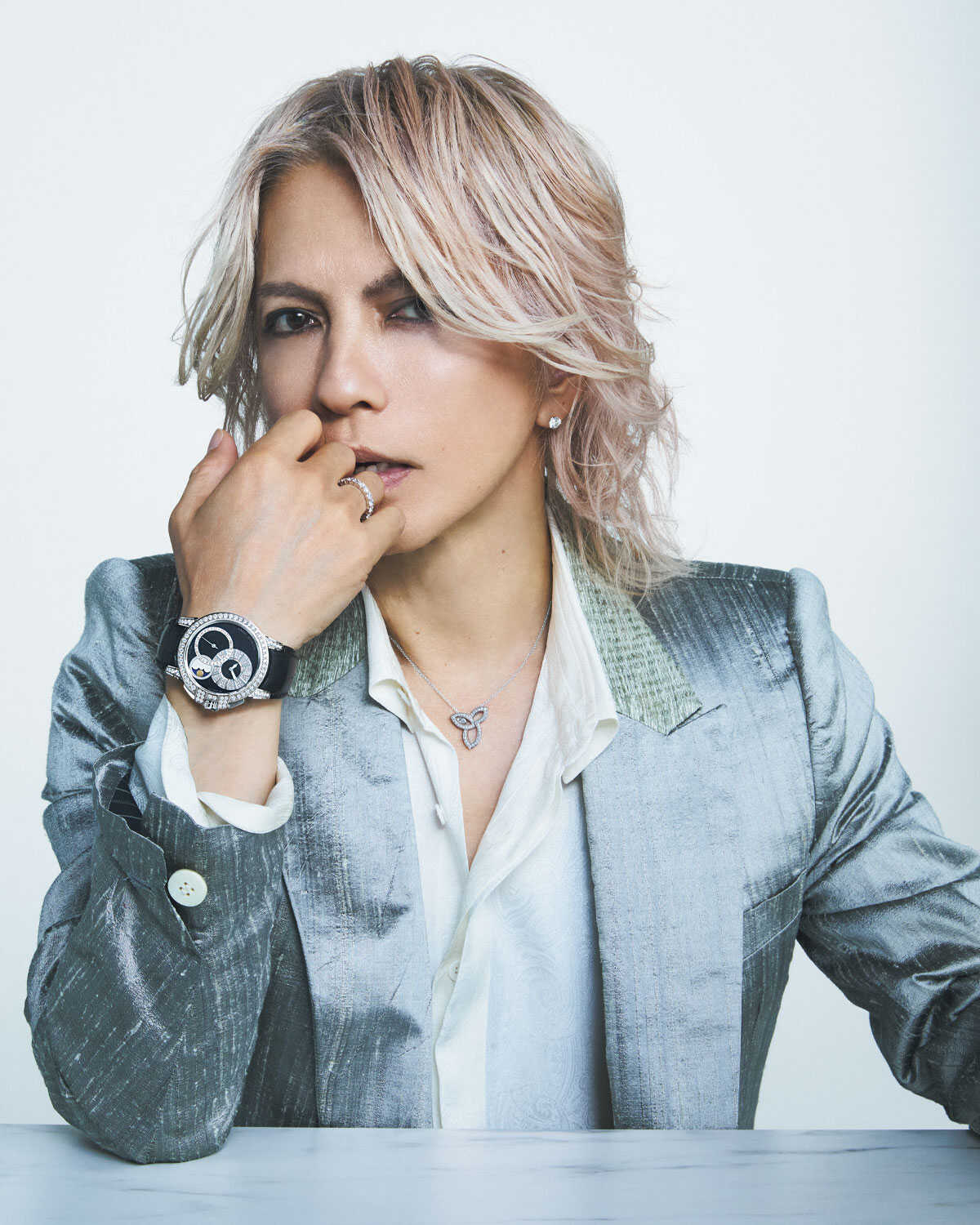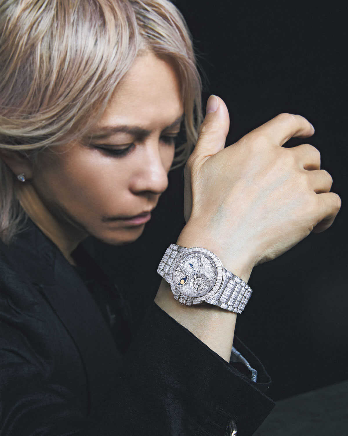 ダイヤモンドに関して、「純粋、クリアなイメージですよね。世界で一番硬いので、無垢で強い印象があります」と語るHYDE。着用したハイジュエリーウォッチはそんなダイヤモンドの魅力を匠の技で芸術品へと昇華。オフセンターの時・分表示、ムーンフェイズとともに見る人を一瞬で魅了する。