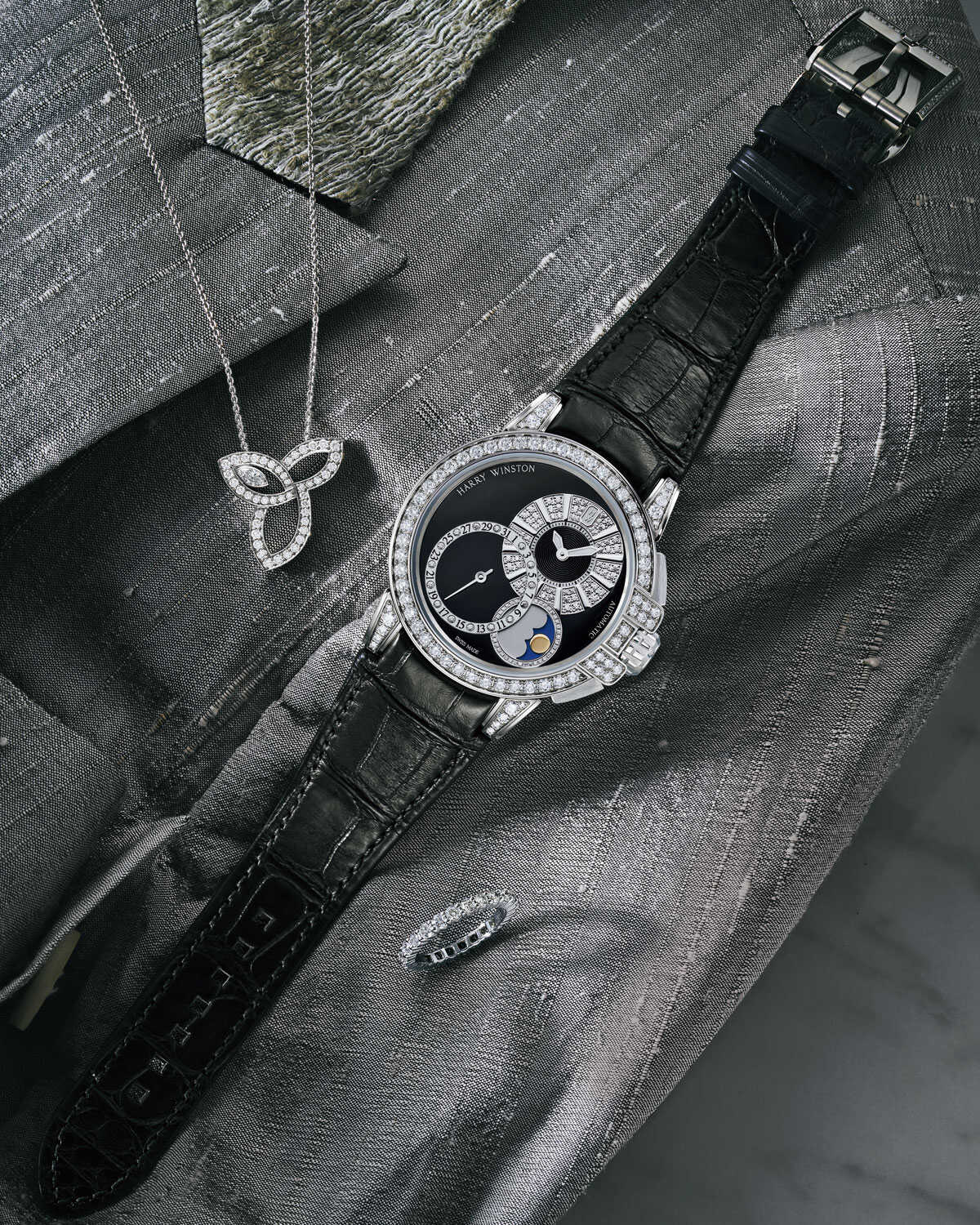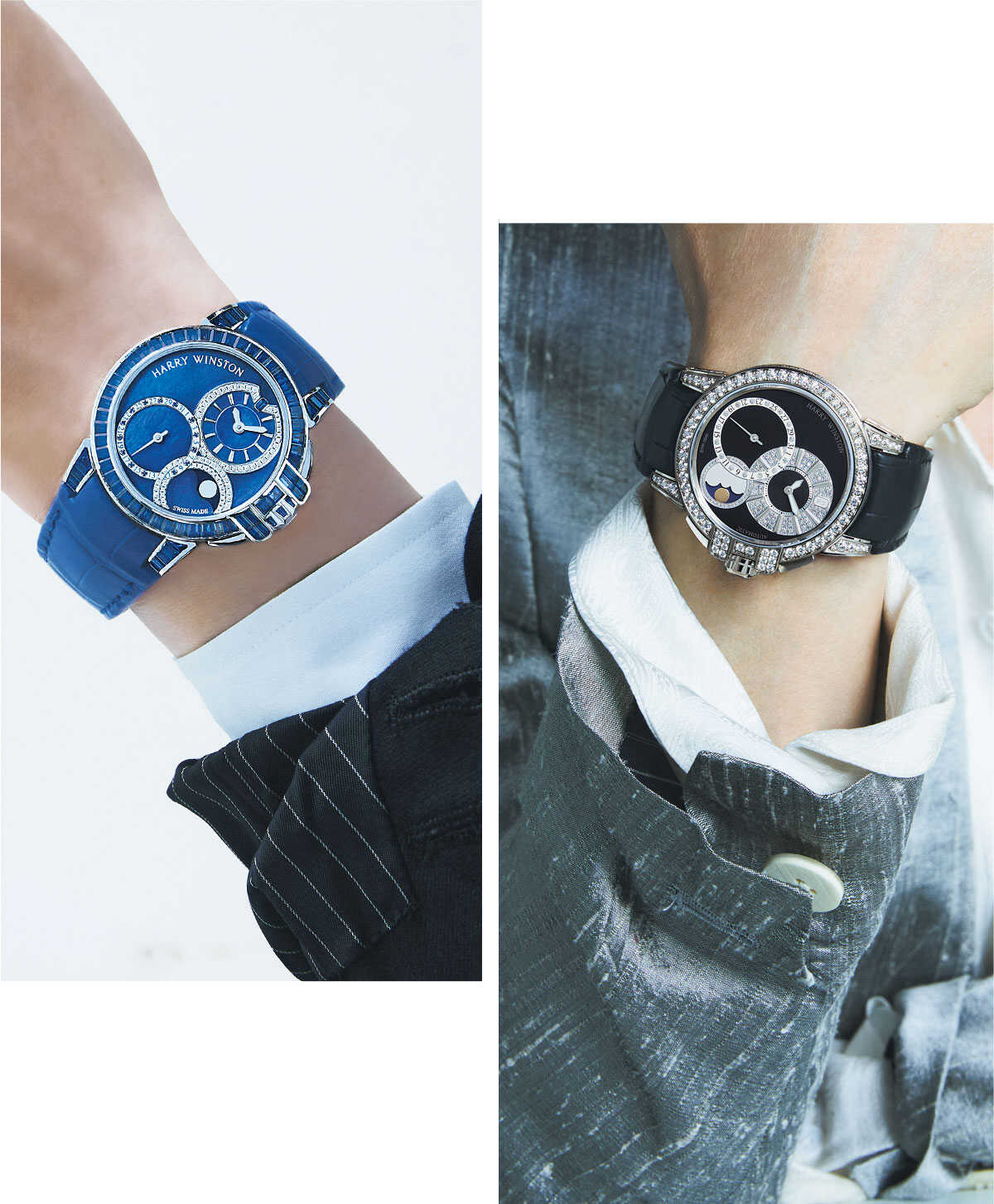 「なりたいと思う理想像に向けて、自分を当てはめていく感じです」。それがHYDE流のこだわり。服やボディ、髪型も常に理想に向けて試行錯誤しているという。HYDEが着用した腕時計も最高峰のダイヤモンドと卓越した時計製造技術を融合した〈ハリー・ウィンストン〉が求める理想を体現した1本。漆黒のダイヤル上で、オフセンターの時・分表示、ムーンフェイズが眩い輝きとともに見る人を魅了する。