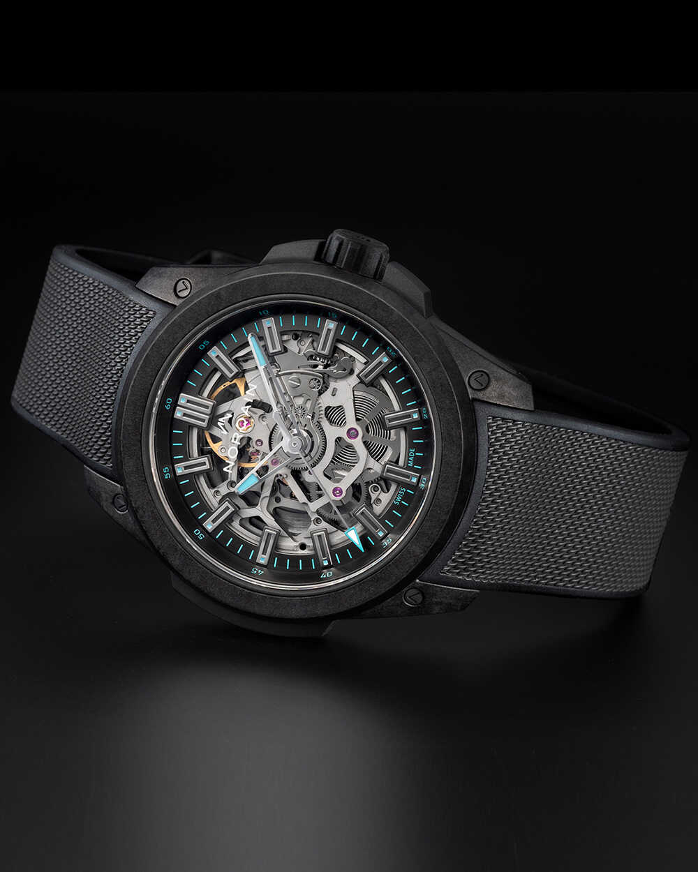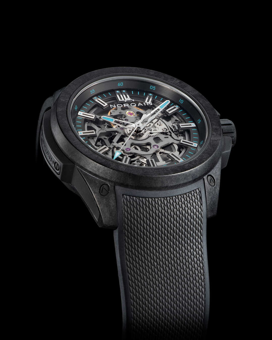 繊細な陰影を楽しめる“ワイルド ワン スケルトン JP 42MM”だが、ダイヤルに散りばめられたターコイズブルーによって〈ノルケイン〉らしさを楽しむことも。ターコイズブルーは、フラッグシップモデルの“ワイルドワン”にも採用されている配色だが、本作ではこれをアワーマーカーにワンポイントのアクセントカラーとして採用。アワーマーカーのインデックスと時分針、秒針、ミニッツマーカーにこの爽やかな配色があることでスポーティさがプラスされ、スケルトンダイヤルの精密さ際立って見える。そんな演出効果も期待できるのもまた、〈ノルケイン〉らしい作り込みといえるだろう。こうした限定モデルや話題作を常に発表し続け、話題に事欠かない〈ノルケイン〉だが、これからも話題が盛りだくさんのようだ。