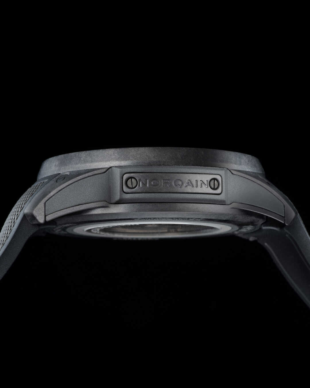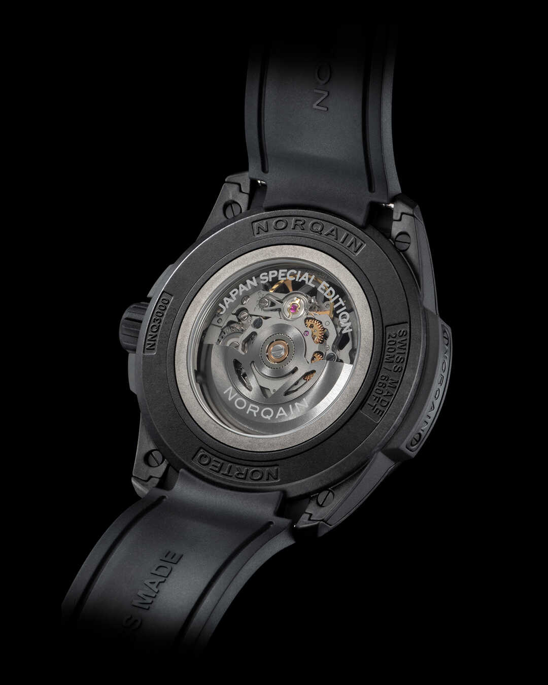「まず最初にお伝えしておきたいことは、日本の時計愛好家の皆さんの感性の豊かさに対し、私自身が非常に感銘を受け、リスペクトをしているいうことです。細部やディテールに対するこだわりと高い審美眼は、世界でも類を見ないほど素晴らしいものであると感じています。だからこそ、今回の限定モデルでは、ディテールに強いこだわりを持って開発しています。そのひとつが配色なのですが、この時計、一見するとオールブラックのように見えるかもしれませんが、実は違います。ケースに採用した独自のカーボン複合材“ノルテック”は漆黒ですが、そこに重ねたラバー製ミドルケースはアンスラサイトグレーになっているのです。さらによく見ていただくと、インナーベゼルのアウターリングやラバーストラップもグレーに。黒のワントーンのようにも見えるけど、実は美しいトーンを楽しめる。繊細な感性を持つ日本の皆さんであれば、この陰影の美しさをきっと楽しんでもらえるのではないか。そんな思いを込めたディテールのひとつです」