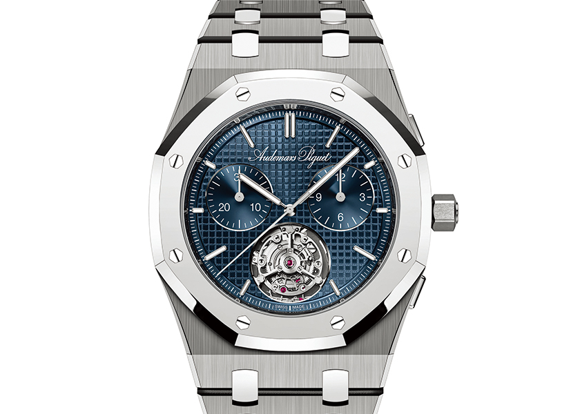 ブランド150周年を記念したトゥールビヨン搭載モデル。チタンと希少なバルクメタリックガラスを採用、軽量性・耐久性・輝きのバランスを追求し、複雑時計の新時代の扉を開ける。限定150本。ケース径39㎜、自動巻き、チタンケース&ブレス、2気圧防水。価格要問い合わせ(オーデマ ピゲ/オーデマ ピゲ ジャパン)