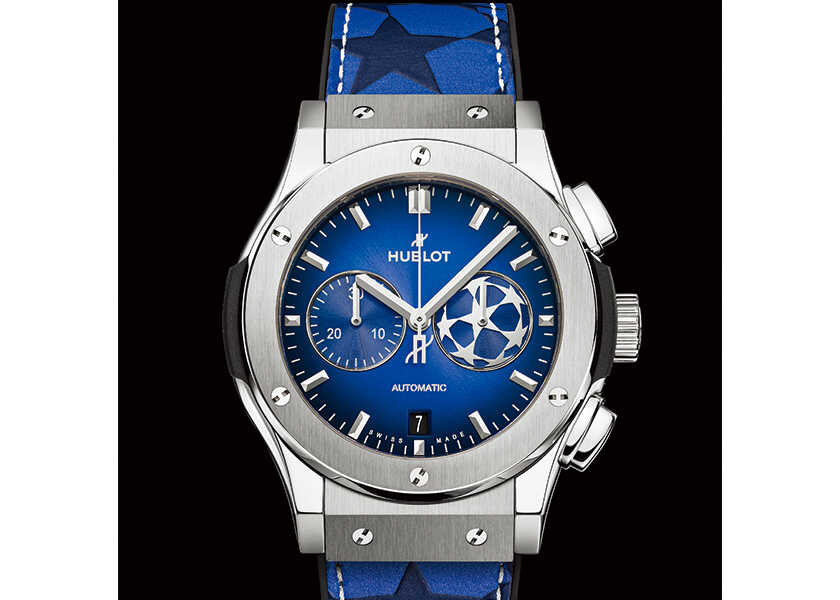 “UEFAチャンピオンズリーグ”のオフィシャルウォッチ就任10周年を記念するモデル。テーマカラーであるブルーで彩色され、リーグを象徴する星印をインダイヤルやストラップに刻印。世界限定100本。ケース径42㎜、自動巻き、チタンケース&ブレス、5気圧防水。189万2000円(ウブロ/LVMHウォッチ・ジュエリー ジャパン ウブロ)