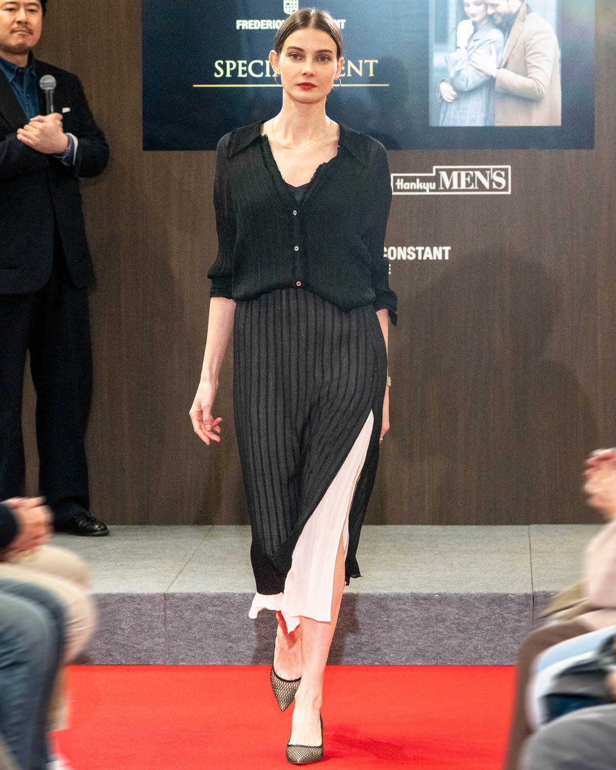 高倉「いかに時計をキレイに魅せてあげるかがポイントでした。黒をベースにしていますが、フォーマルにならないよう白がのぞくスカートを合わせて、さらにドレープ感のあるアイテムで柔らかさを表現しています」園部「まさに時計が主役のコーディネートですね。夜のパーティなどにもふさわしいと思います」