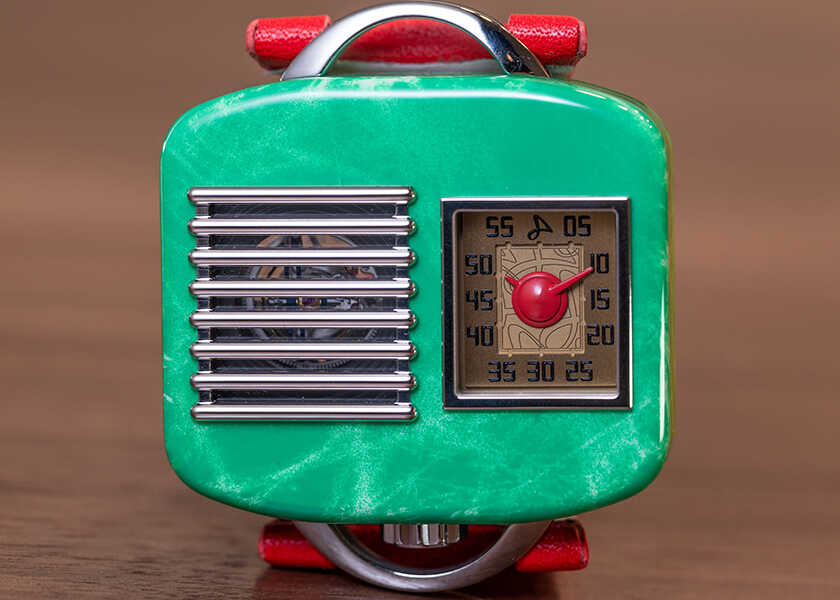 レトロヴィジョン‘47は、ブランド創立20周年を記念して製作。1940年代の伝説的なラジオ受信機を、腕時計へと昇華させた、遊び心とノスタルジーに溢れるモデル。〈オートランス〉のクリエイションが、伝統的な時計製造の枠には留まらず、あらゆる世界観からインスピレーションを吸収し続けていることがよく分かる1本だろう。“バック・トゥ・ザ・レトロ・フューチャー”をテーマに、ゼネラル・テレビジョン&ラジオ・コーポレーションの名機“モデル5A5”をモチーフに採用。機能としては時針と分針のみで、時を告げるシンプルなスタイルでありながら、時空を超えた唯一無二のデザインに。