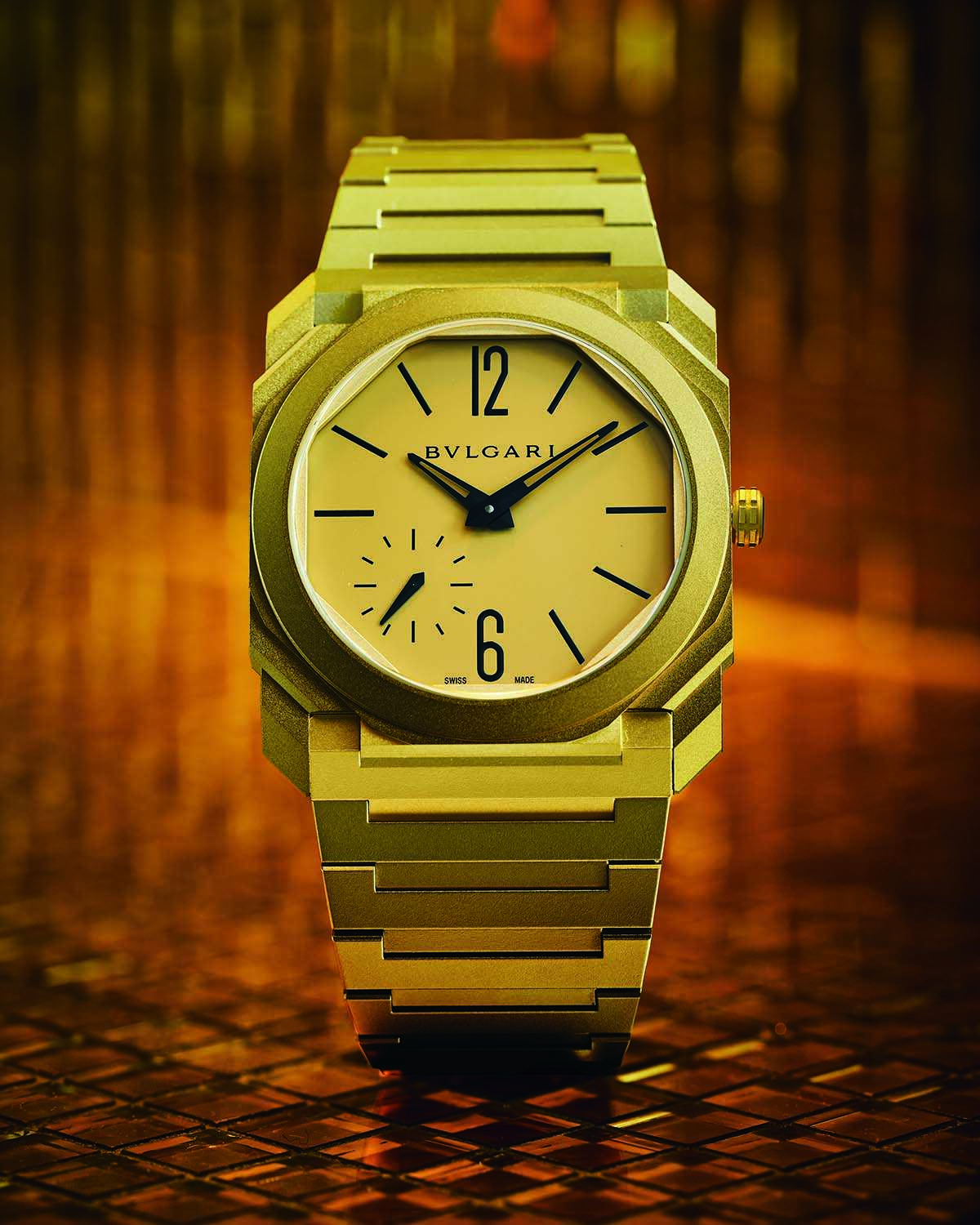 2017年に登場し、コレクションで3度めの世界最薄記録を打ち立てたBVL138を搭載。マイクロローターを採用した自動巻きで2.23㎜厚を実現し、ケースは5㎜の薄さを誇る。ケースとの一体感あるデザインのブレスレットは、バックルの折り畳み部分も埋め込み、心地よい装着感を損なわない。ケース径40㎜、自動巻き、18KYGケース&ブレス、100m防水。 723万8000円(ブルガリ/ブルガリ・ジャパン)