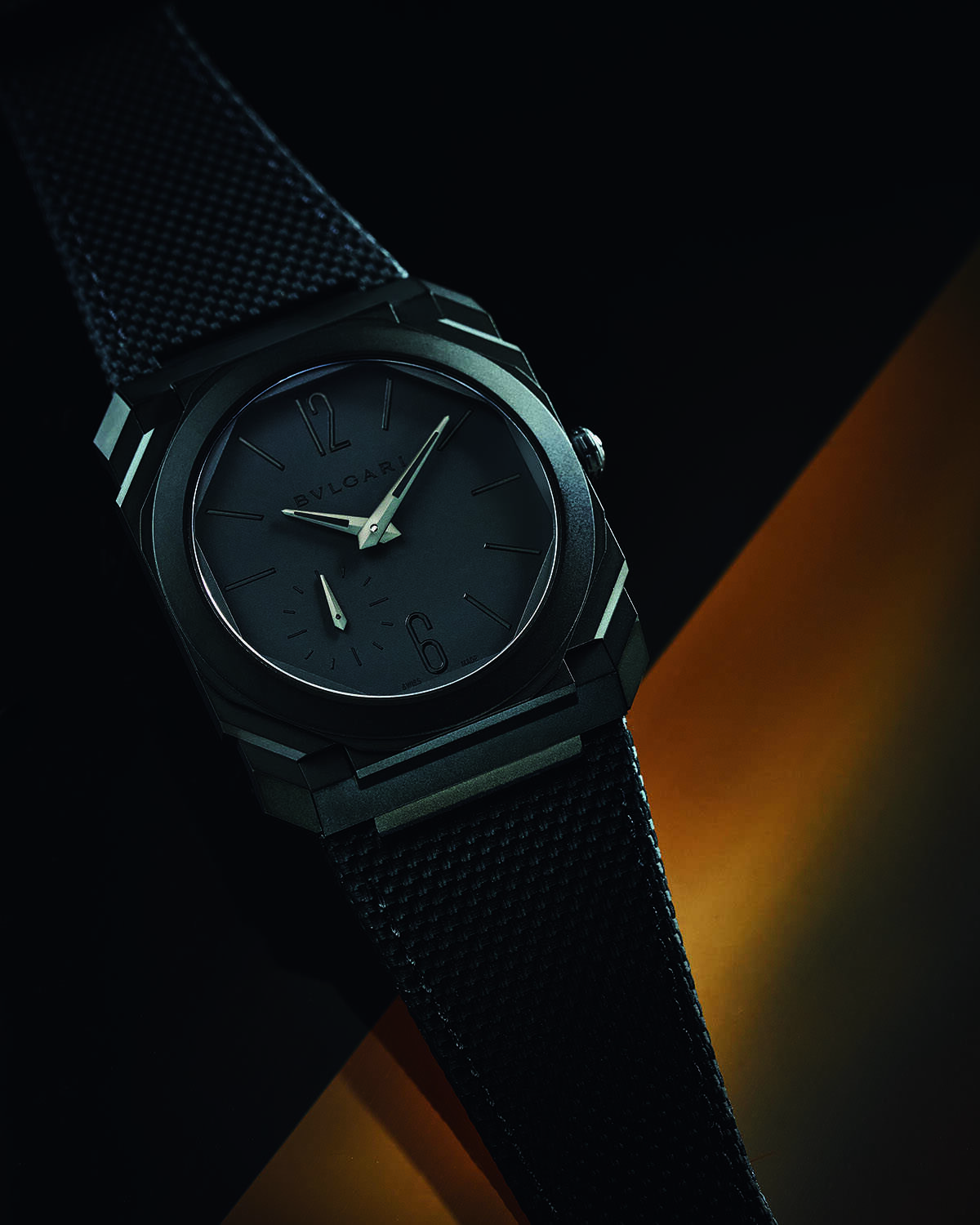 サンドブラスト加工のチタンケースにブラックDLCを施し、素材の軽量性とストラップのフィット感でひと際薄さが感じられる。多面は光を受けて表情豊かに変化し、文字盤やインデックスもオールブラックで統一するが、ドーフィン針をセンターラインで山折りし、コントラストによって視認性を保持する。ケース径40㎜、自動巻き、チタンケース、ラバーストラップ、30m防水。238万7000円(ブルガリ/ブルガリ・ジャパン)