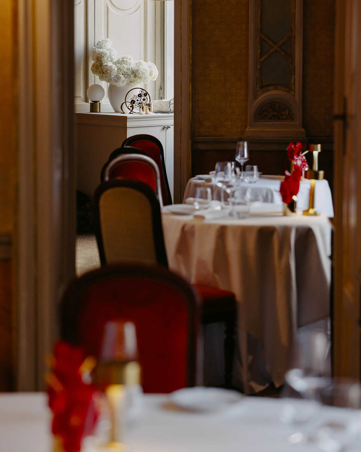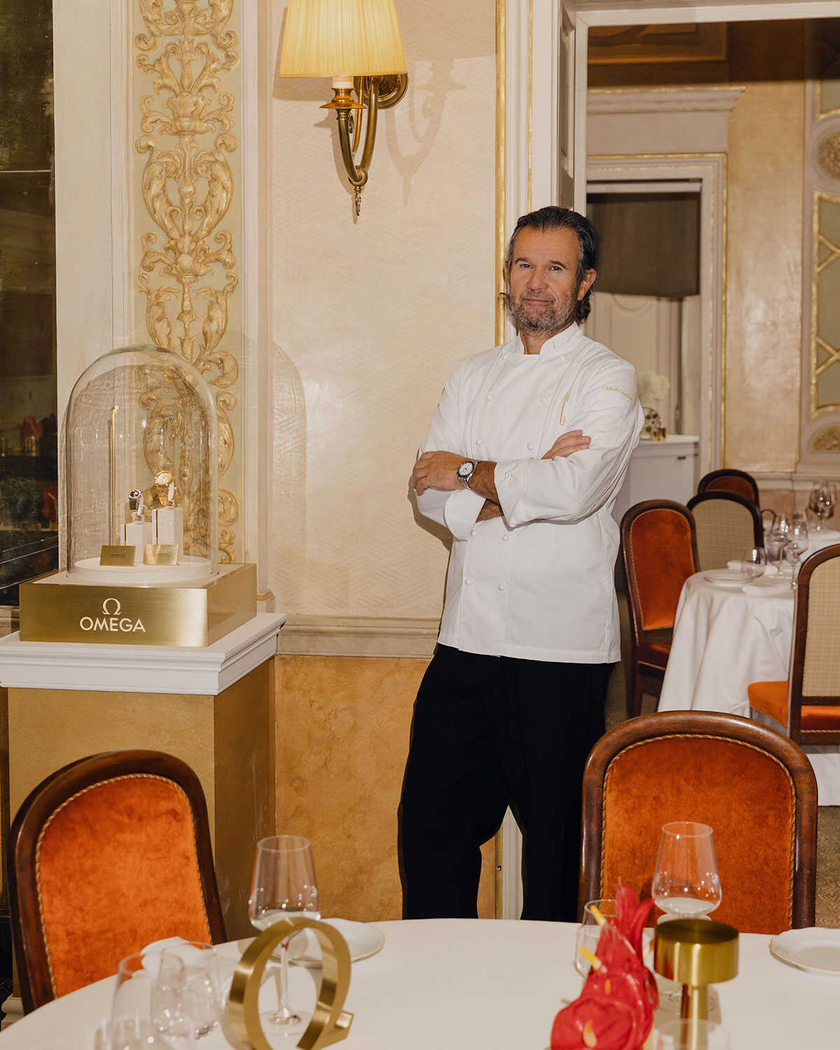 日中はエレガントで没入感ある空間の中、世界最高峰と称される〈クラッコ〉の料理を愉しみながら、大型スクリーンで競技観戦するひとときを提供し、夜はゲストとともに華やかなイベントが繰り広げらる。こうした特別な空間を通じて、オフィシャルタイムキーパーとしての94年にもわたる歩みを讃える場、それがオメガハウス ミラノなのだ。