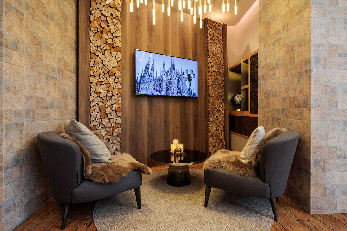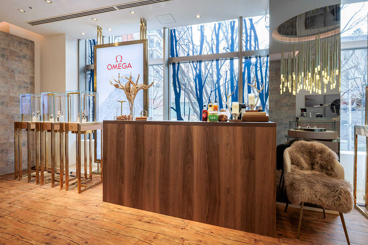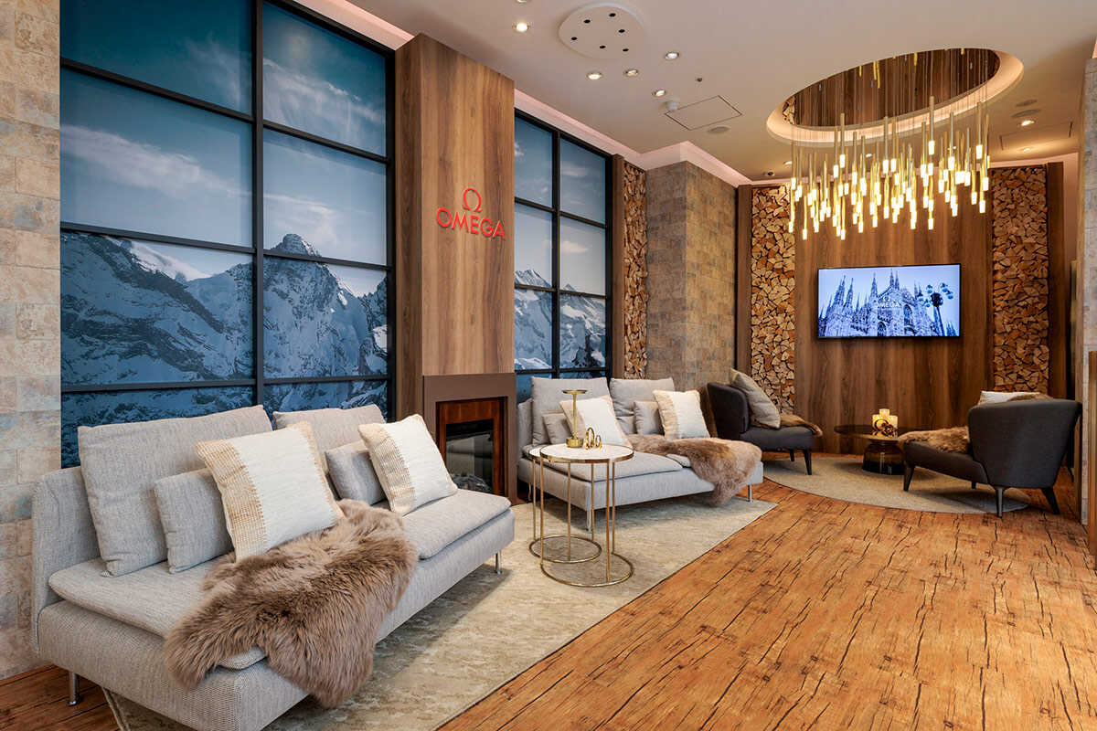 ちなみに、さすがにミラノまでは行けないという人に朗報。日本でもミラノ・コルティナ2026冬季オリンピックを記念して、オフィシャルタイム キーパーである〈オメガ〉が、オメガブティック六本木ヒルズの2階にスイスのシャレーをイメージした 空間を誕生させたのだ。 螺旋階段を上がると、寛げる空間が広がり、スイスのシャレーをイメージしたラウンジが登場。まるでスイスのアルプスにあるスキーリゾートを訪れたかのようなコージーで温かみのある印象を与える空間には、床にウッドデッキを敷きつめ、壁にも木材をイメージしたデザインを採用。壁の一部には、レンガパターンの装飾や、気持ちまでほぐれるような暖炉をイメージしたスペースもあつらえている。周辺には丸太を積み上げたイメージや、見渡せばスイスのアルプスや木々に囲まれ、まるでミラノ・コルティナ2026冬季オリンピックの会場にいるかのよう。3月22日までの会期中、土・日・祝日〈2月6日(金)、3月6日(金)も含む〉の13:00~18:00まで、ホットコーヒー、カフェラテ、ホットココアなどのスペシャルドリンクサービスも用意されているので、ミラノまで行けない方はこちらに是非チャレンジを。