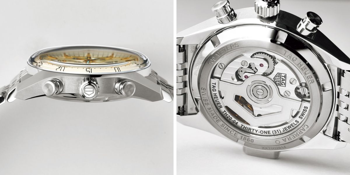 右 : 搭載するムーブメントは自社製のキャリバーTH20-04。シースルーバックからも、その美しい姿を鑑賞可能 左 : 初代カレラで採用されたグラスボックスと呼ばれる風防も特徴