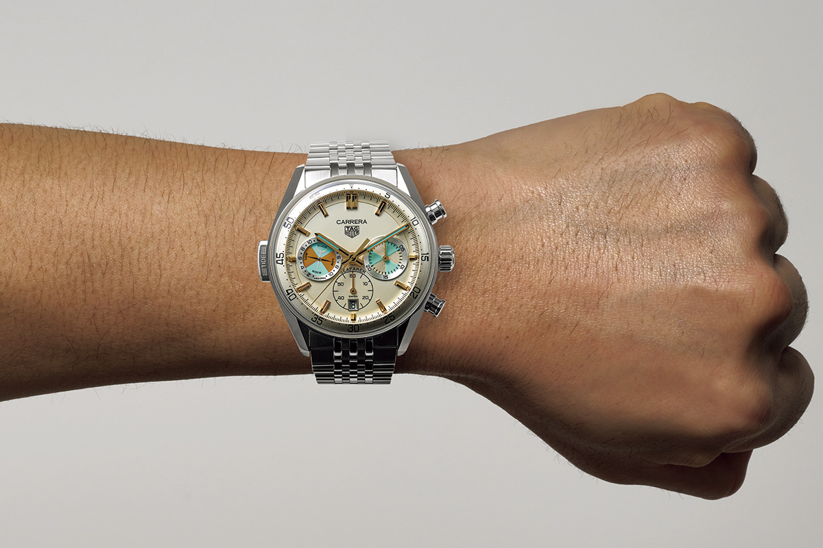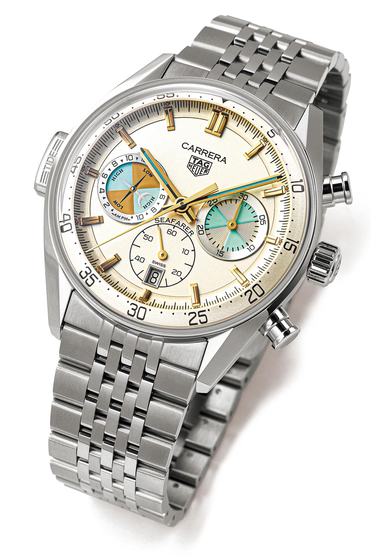 〝シーファーラー〞の名は、1968年に誕生したヘリテージから継承したもの。モデルの特徴は潮の満ち引きを表示する潮汐機構を搭載していることで、船乗りやヨットマンのために生まれた。現代モデルではケースサイドのボタンを押して機構を操作できるように利便性が向上している。〝タグ・ホイヤー カレラ〞は、60年以上の歴史がある傑作なので、レトロなカラーリングとの相性も抜群だ。