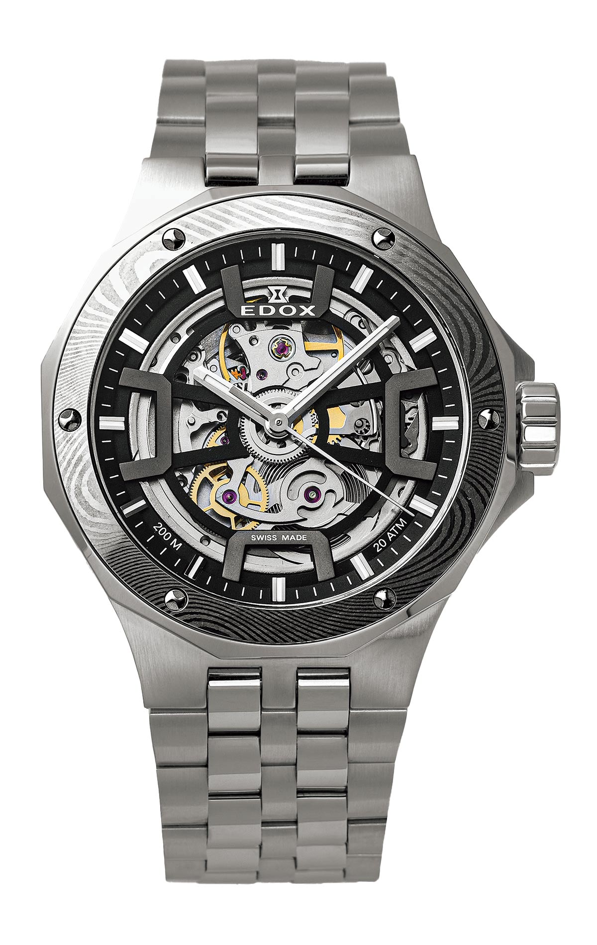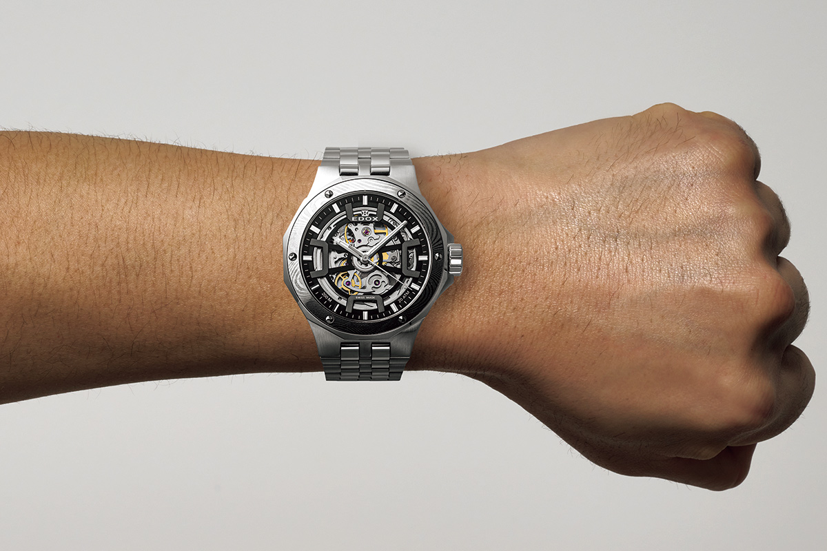 防水性に優れるスポーツウォッチを作ってきた〈エドックス〉。このモデルは、1973年モデルから継承される十二角形ベゼルと砂時計ビスが特徴。ベゼル素材には、美しい波模様をもつ神秘的な素材、ダマスカス鋼を使用した。その模様は同一ではなく、すべてが一点モノという魅力を持っている。ムーブメントはシースルー仕様になっており、メカニズムを見せることで、さらに迫力を強めた仕上がりに。