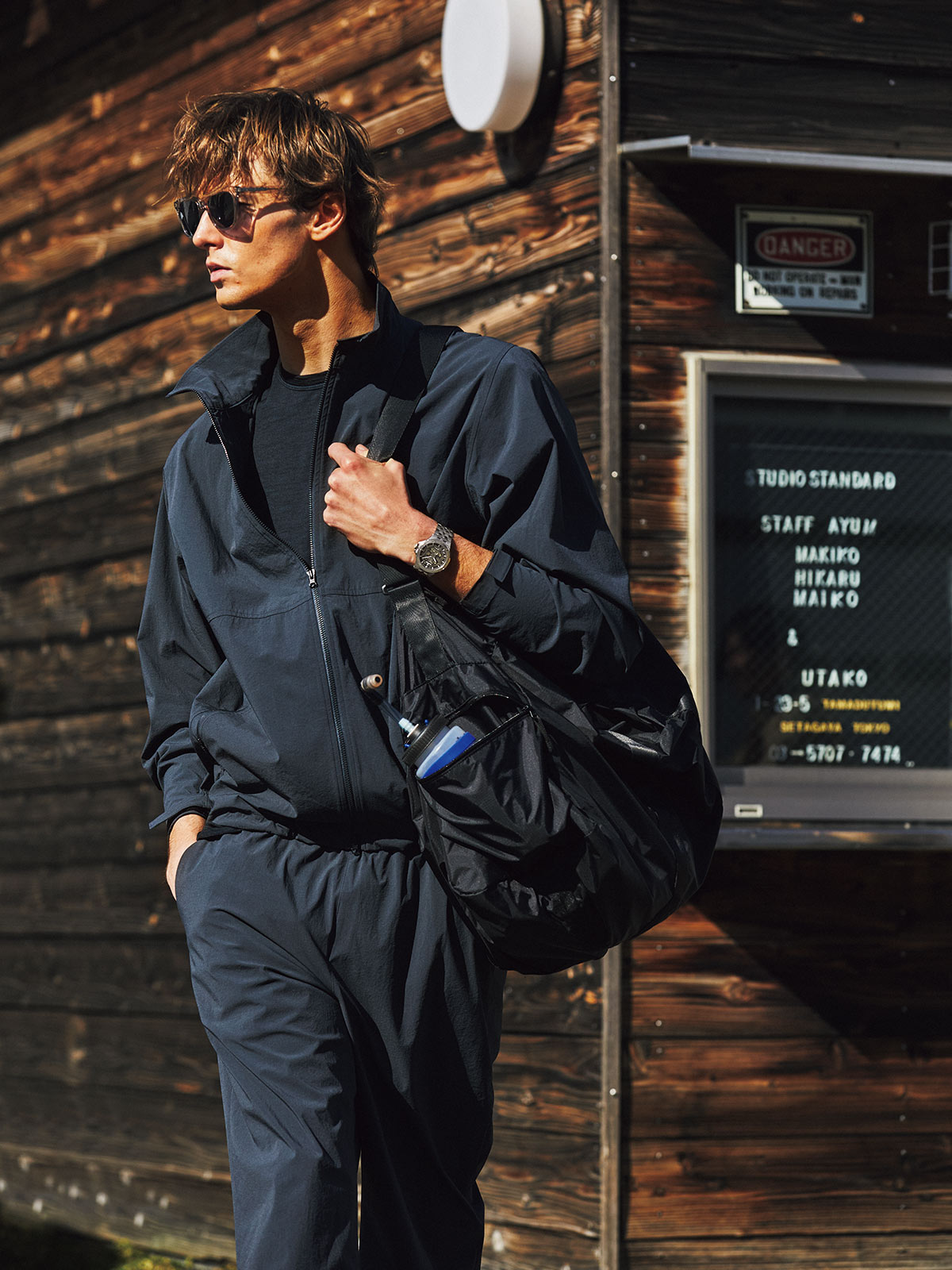 本格的サーフィンシーズンに向けて、体幹を鍛えるためにジムへ。ジム帰りは歩きが定番ルーティンなので、ファッションは動きやすさを意識したアスレジャースタイルに。動きやすいけど、どこかに高級感を加えておくのが大人の楽しみ方。防水ウォッチの雄〈エドックス〉の〝デルフィン〞は、メカっぽさが都会的で、スポーティなブルゾンのアクセントになる。アクティブだけど洗練度も欲しい、そんな理想を叶えてくれる。