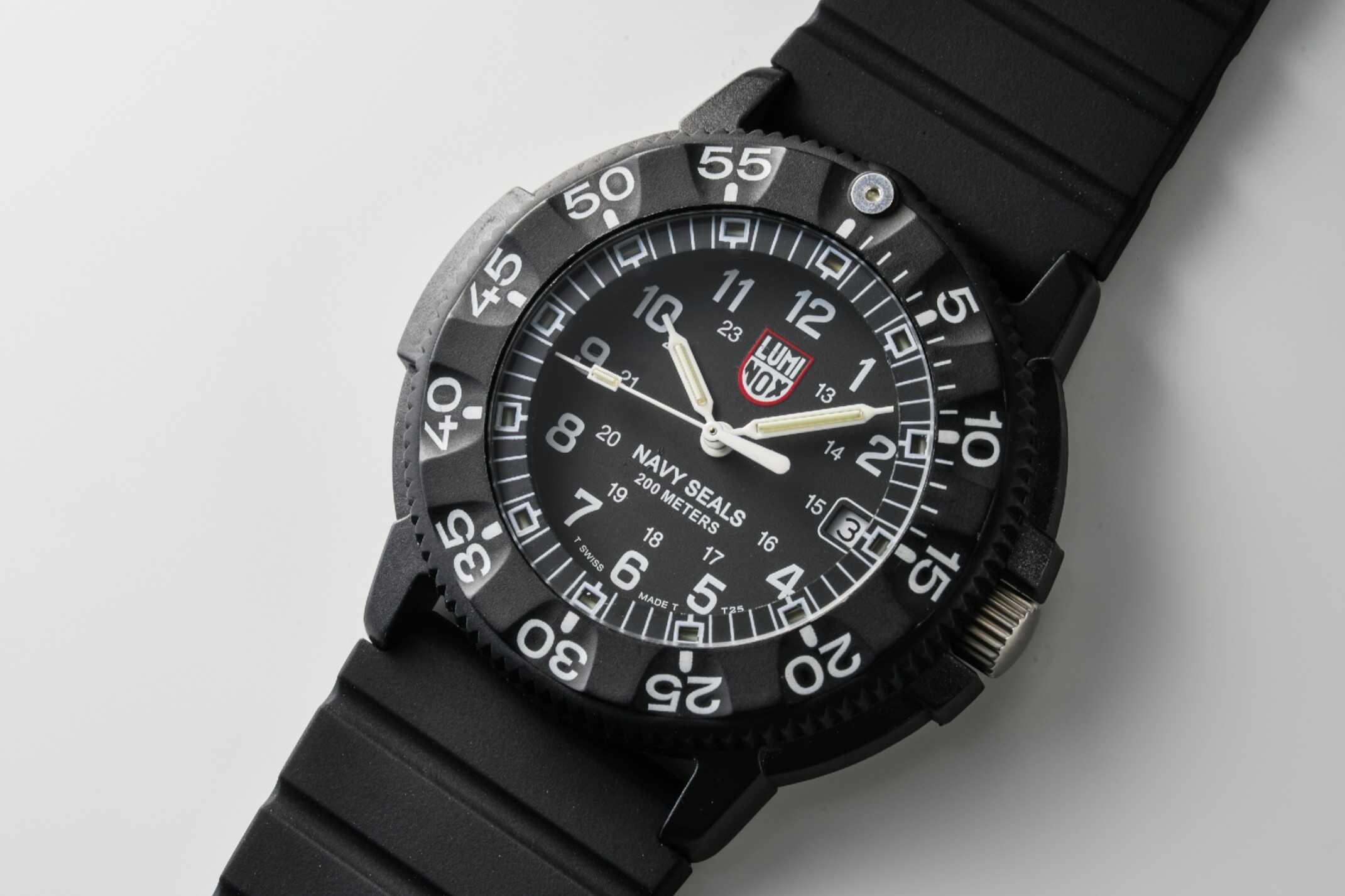 こちらは初代モデル。ダイヤルには“NAVY SEALS”の文字があしらわれ、自己発光システム“ルミノックス・ライト・テクノロジー”のカプセルも現行より小さめ