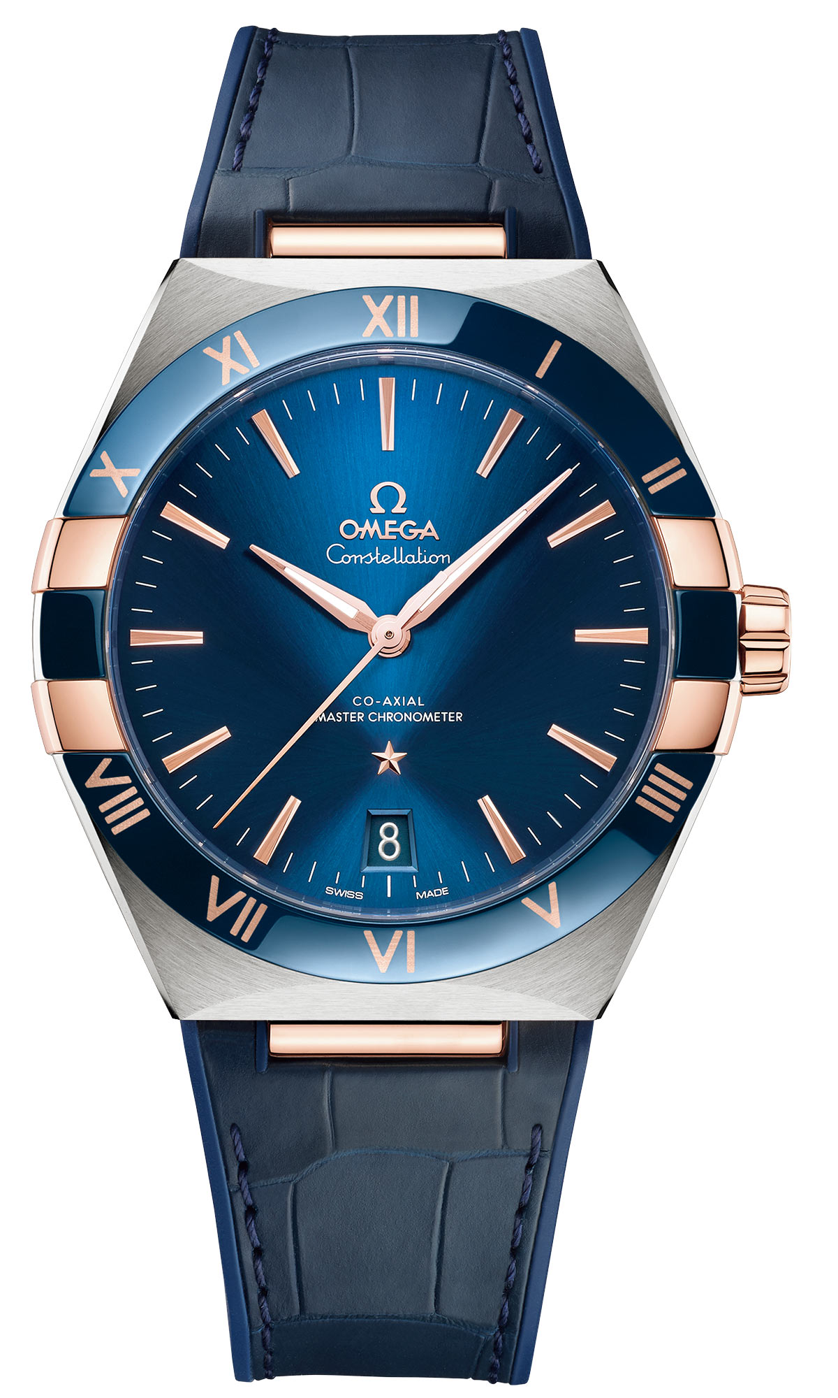 18 K セドナゴールドとサンブラッシュ仕上げのブルーダイヤルとのコントラストが、美しく際立つドレスウォッチ。ケースサイドのハーフムーンデザインや6時位置の星など、アイコニックデザインは健在。ケース径41㎜、自動巻き、SS×18 Kセドナゴールドケース、アリゲーターストラップ、5気圧防水。163万9000円(オメガ)