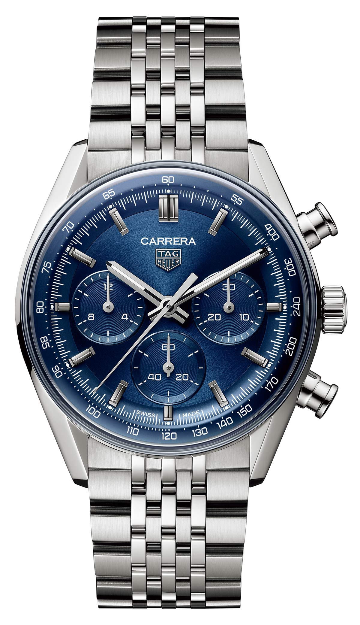 同社を代表するレーシングクロノグラフ。速度を計測できるタキメーターを外周に配置。往年の意匠を再現したドーム型風防〝グラスボックス〞は、サイドからも文字盤がよく見える。ケース径41㎜、自動巻き、SSケース&ブレス、100 m防水。114万9500円(タグ・ホイヤー/LVMHウォッチ・ジュエリー ジャパン タグ・ホイヤー)