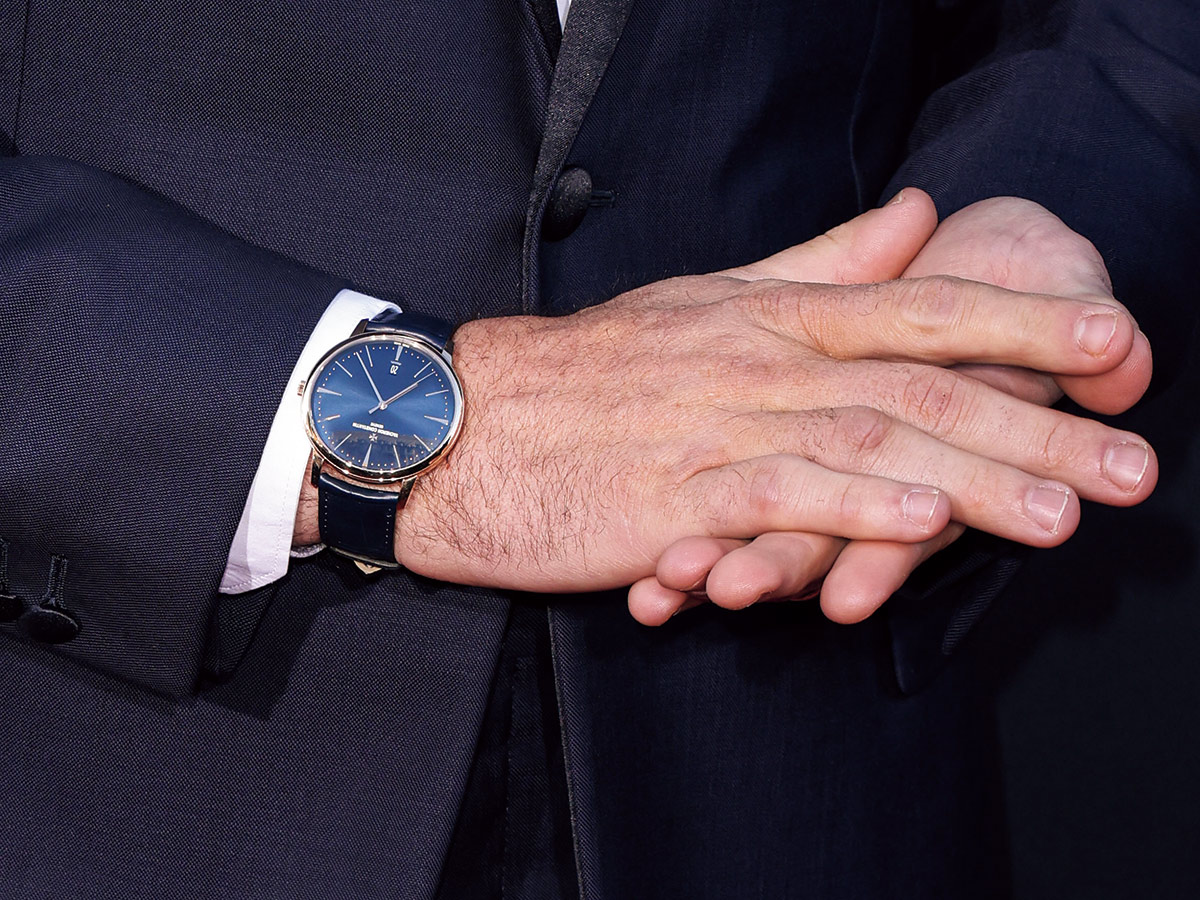 正装姿に品格を印象づける1本として、最高峰と名高いドレスウォッチを選択。ミッドナイトブルーのタキシードにも映える。