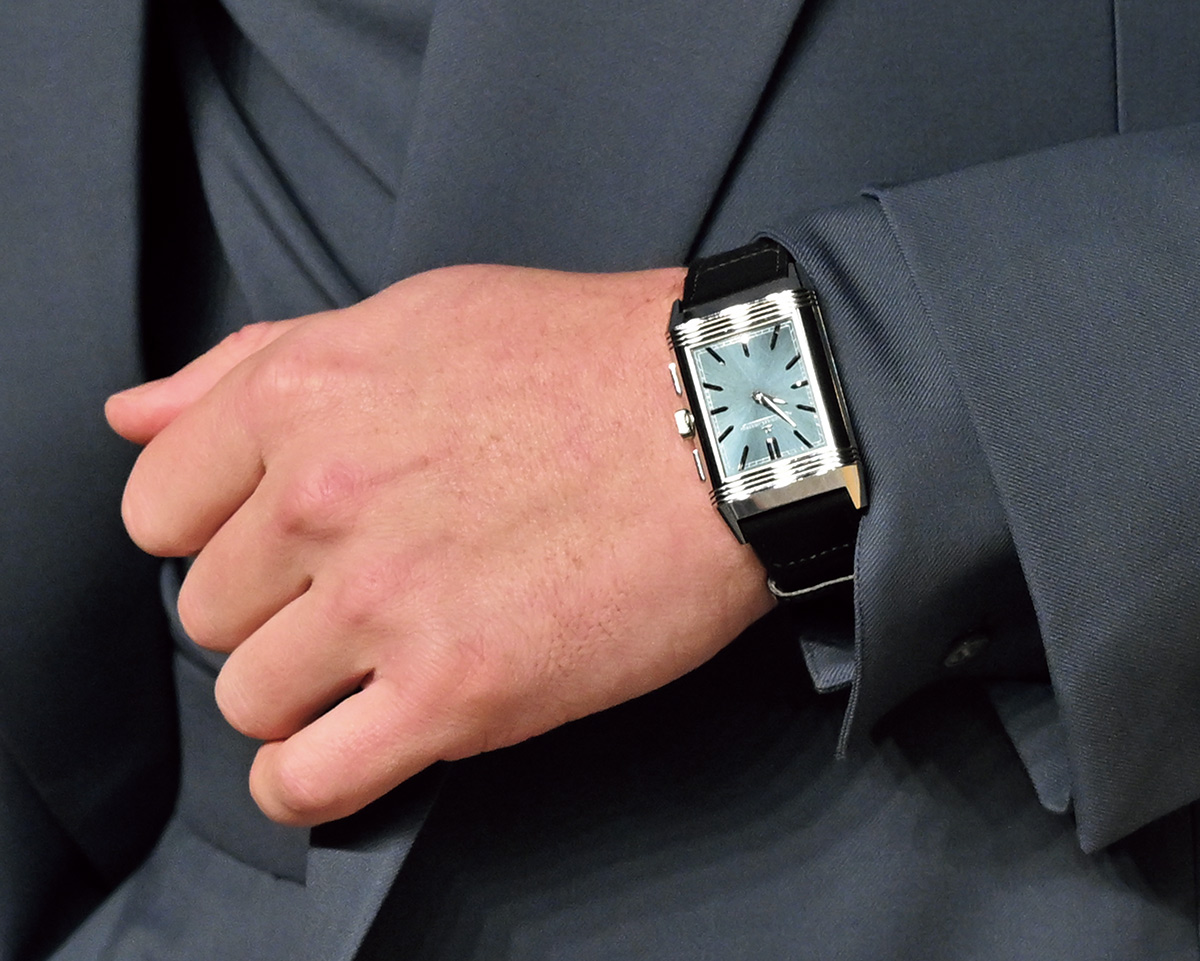 レベルソ・トリビュート・クロノグラフ創業190周年の節目を迎えた2023年に、角型の反転式ケースで知られる旗艦コレクション〝レベルソ〞へのオマージュとして製作された傑作。時刻表示とクロノグラフ機能を、表裏のダイヤルに振り分けた設計が特徴的。ケースサイズ49 . 4×29 . 9㎜、手巻き、SSケース、カーフストラップ、30 m防水。437万8000円(ジャガー・ルクルト)