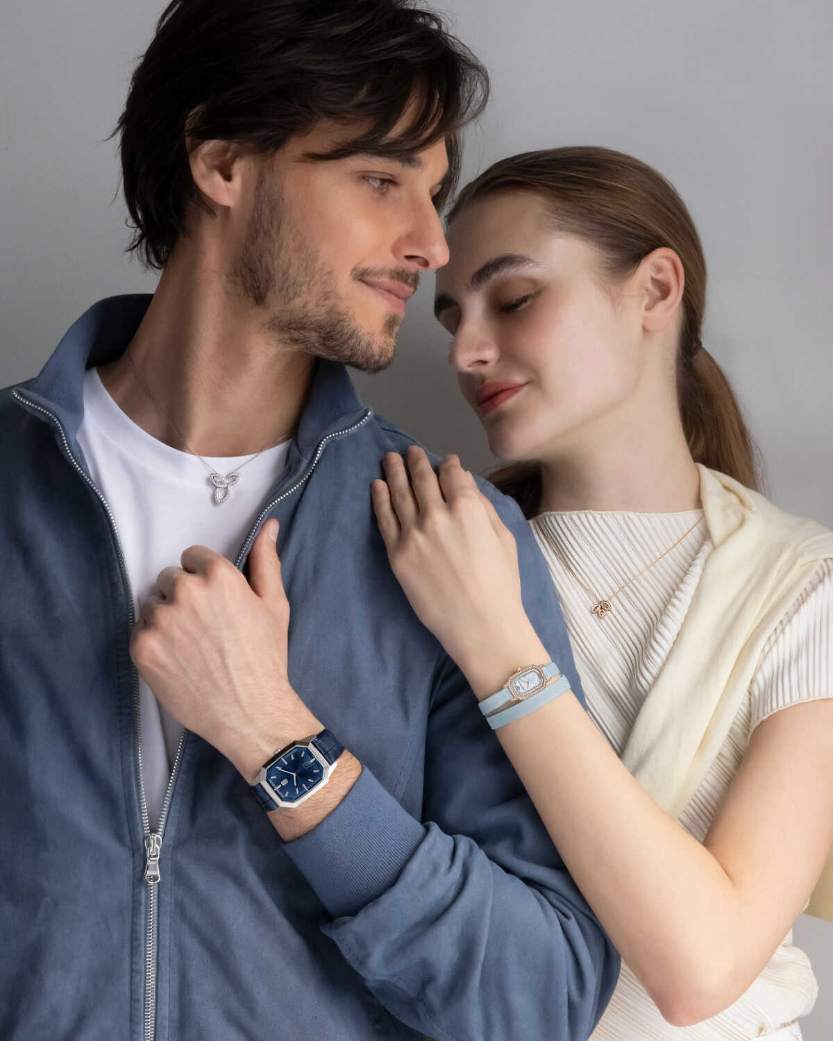 男:リリークラスター・ペンダント(PT×ダイヤモンド)165万円、腕時計“HW エメラルド・オートマティック 33mm”(WG)338万8000円(以上ハリー・ウィンストン/ハリー・ウィンストン クライアントインフォメーション)、スウェードブルゾン19万300円(バルバ ナポリ/コロネット)、白Tシャツ1万5180円(サンスペル/サンスペル表参道) 女:リリークラスター・ミニ・ペンダント(RG×ダイヤモンド)※阪急梅田店先行販売 77万円、腕時計“HW エメラルド”(RG×ダイヤモンド×アクアマリン)221万1000円(以上ハリー・ウィンストン/ハリー・ウィンストン クライアントインフォメーション)、トップス 5万3900円(ヴィンス/コロネット)、スカート13万2000円(テン/コロネット)、その他はスタイリスト私物