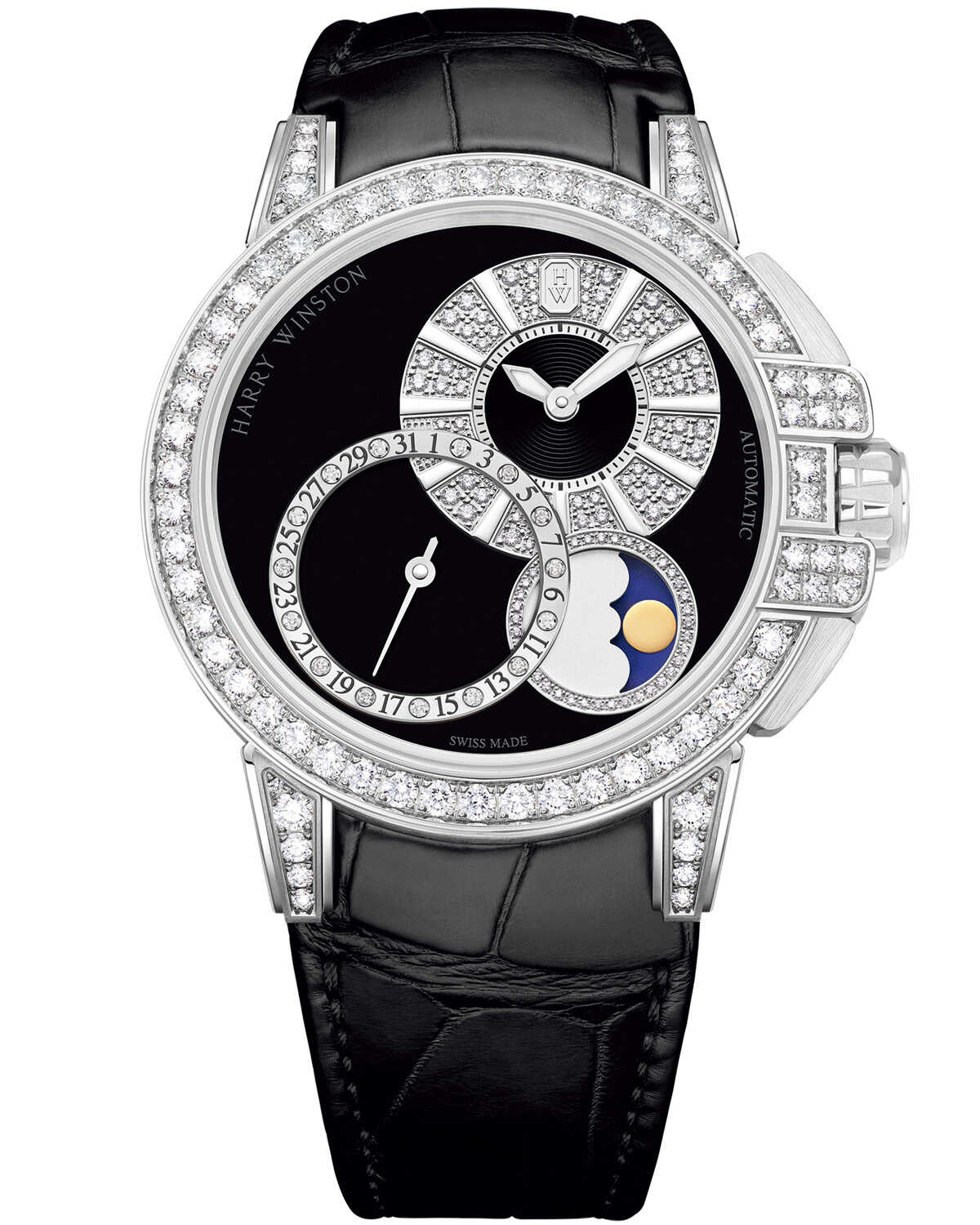 352個のダイヤモンドは総計約4.47カラット。その輝きと漆黒のブラックオニキスのコントラストは圧巻。“HW オーシャン・デイト ムーンフェイズ オートマティック 42㎜” ケース径42㎜、自動巻き、18KWGケース、アリゲーターストラップ、10気圧防水。1335万4000円(ハリー・ウィンストン/ハリー・ウィンストン クライアントインフォメーション)