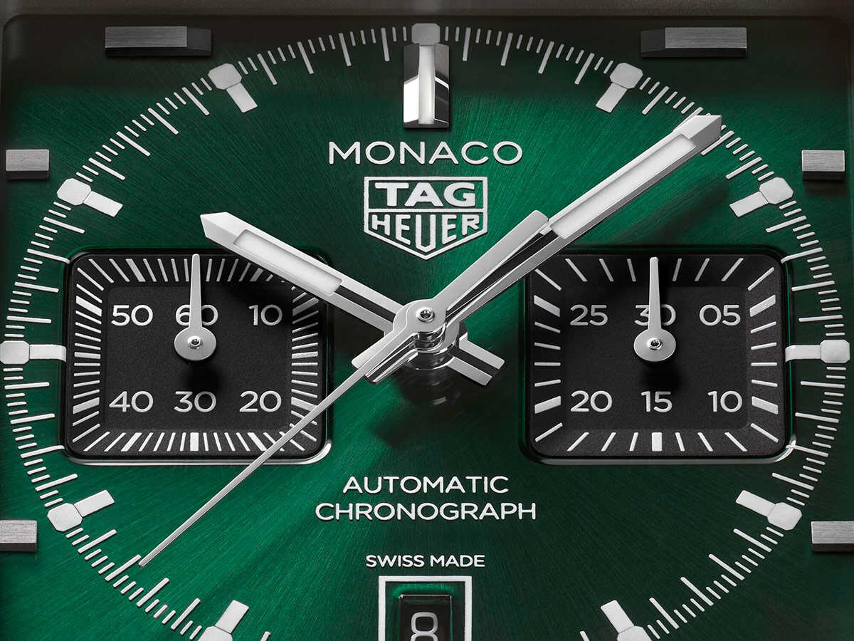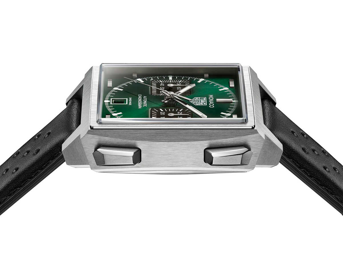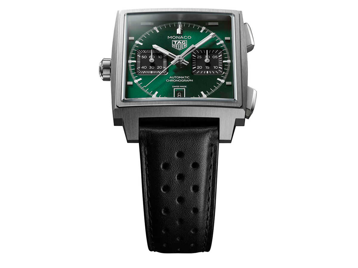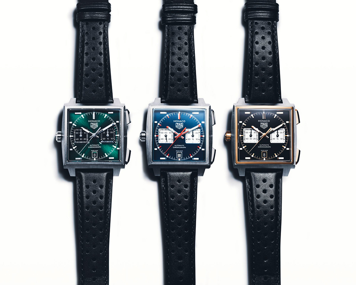 ケースサイズ39mm、自動巻き、チタンケース、ブラックカーフストラップ、100m防水。各134万7500円(以上タグ・ホイヤー/LVMHウォッチ・ジュエリー ジャパン タグ・ホイヤー)3色のカラーバリエーションで展開される今回の新作には、1971年公開の映画『栄光のル・マン』の中で、スティーブ・マックイーンが着用したことで知られる"モナコ"から着想を得たシグネチャーカラーの"タグ・ホイヤー モナコ ブルー"が用意されている。また、洗練されたサンレイ加工サテン仕上げとラッカー仕上げを施したダークグリーンモデルは、クラシックなブリティッシュレーシンググリーンのコードを踏襲。さらに、エレガントなブラックモデルは、グレード5チタンと18K 5Nローズゴールドのツートーンケースに収められており、いずれのモデルも新たにデザインされたグレード5チタン製フォールディングバックルを備えたレーシングスタイルのストラップが組み合わされている。