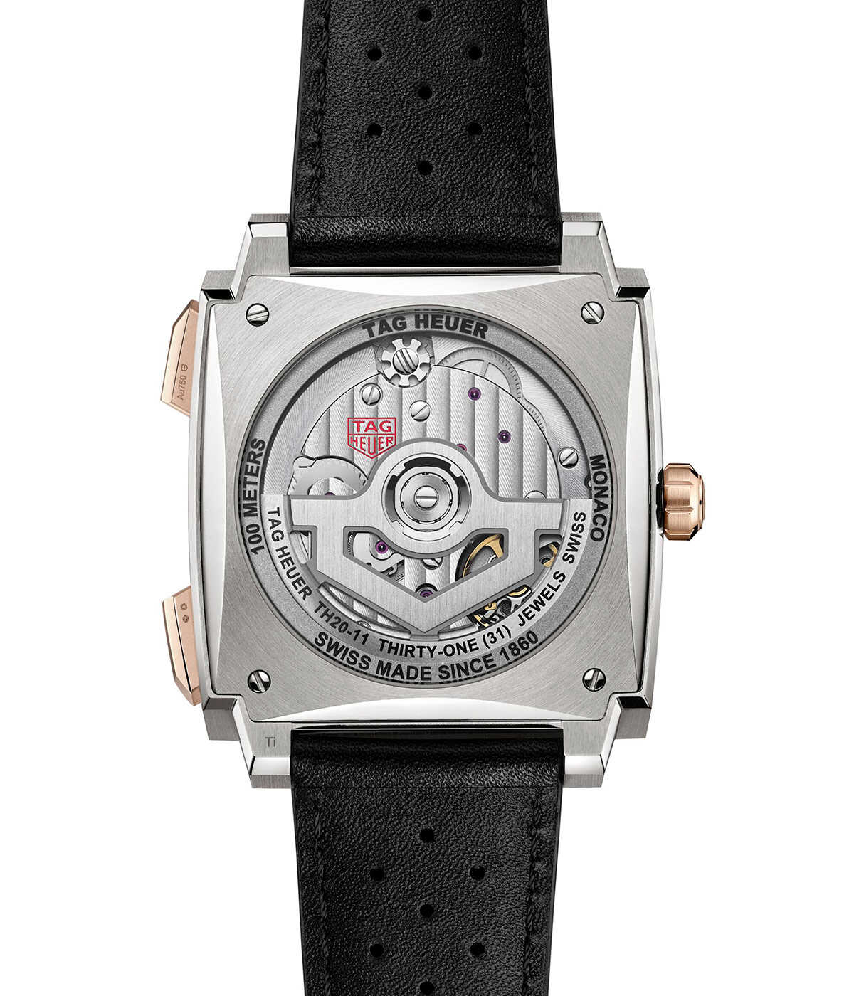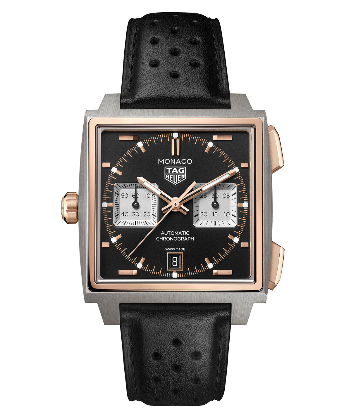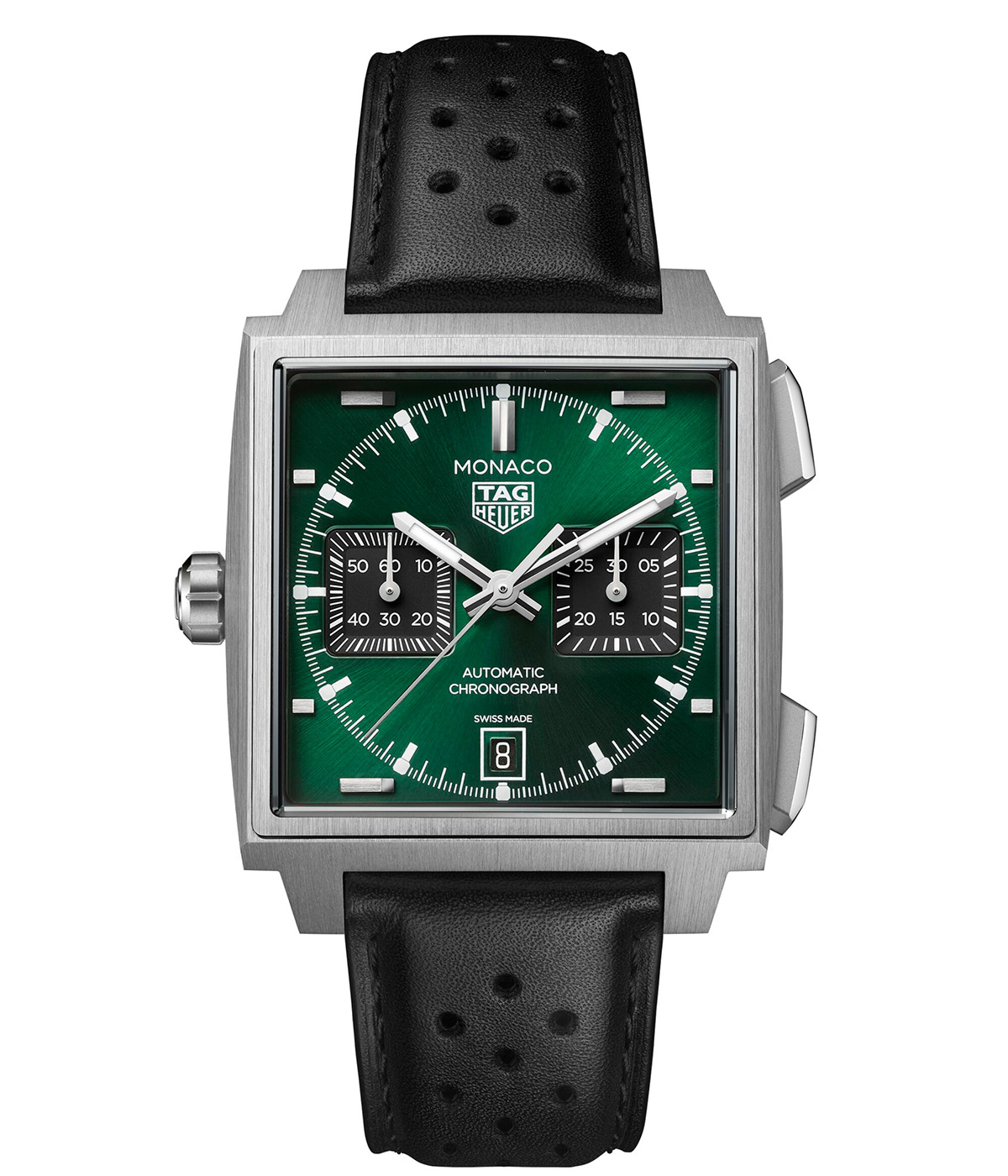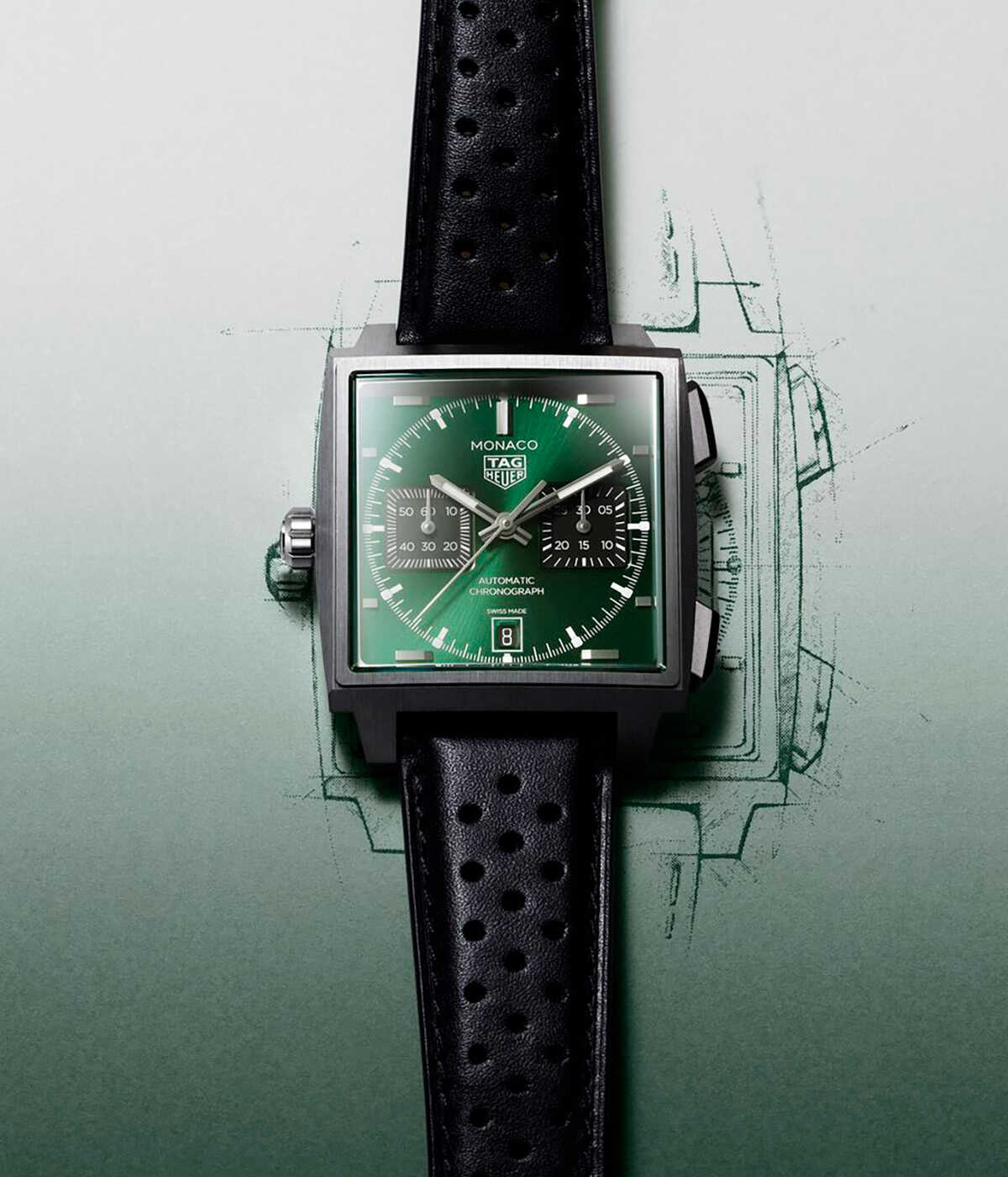 ケースサイズ39mm、自動巻き、チタンケース、ブラックカーフストラップ、100m防水。各134万7500円(以上タグ・ホイヤー/LVMHウォッチ・ジュエリー ジャパン タグ・ホイヤー)3色のカラーバリエーションで展開される今回の新作には、1971年公開の映画『栄光のル・マン』の中で、スティーブ・マックイーンが着用したことで知られる"モナコ"から着想を得たシグネチャーカラーの"タグ・ホイヤー モナコ ブルー"が用意されている。また、洗練されたサンレイ加工サテン仕上げとラッカー仕上げを施したダークグリーンモデルは、クラシックなブリティッシュレーシンググリーンのコードを踏襲。さらに、エレガントなブラックモデルは、グレード5チタンと18K 5Nローズゴールドのツートーンケースに収められており、いずれのモデルも新たにデザインされたグレード5チタン製フォールディングバックルを備えたレーシングスタイルのストラップが組み合わされている。