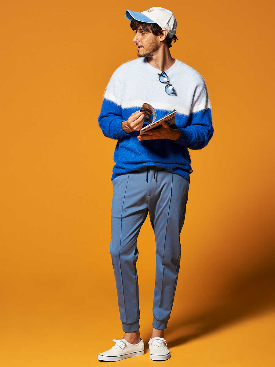 スポーティな印象の強いリブパンツをタウンユースにアップデイトした1本。2色とも『Safari』別注カラーだ。ほどよい光沢とハリ感が特徴の素材を使用。リブ部分は敢えて共地で表現することで大人っぽい雰囲気に仕上げている。カジュアルなトップにも合うし、ジャケットにも合わせることができる万能タイプ。