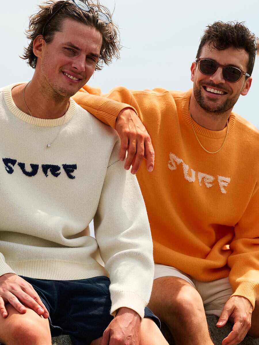 フロントではモコモコに編み立てた“SURF”モチーフを、背中ではジャカード編みで描いたサーフモチーフを主張できるダブルジャカードセーター。しっかりとした膨らみのあるニット自体は弾力もあり、気取らず気負わず秋の海上がりにガシガシと着こなしたい。