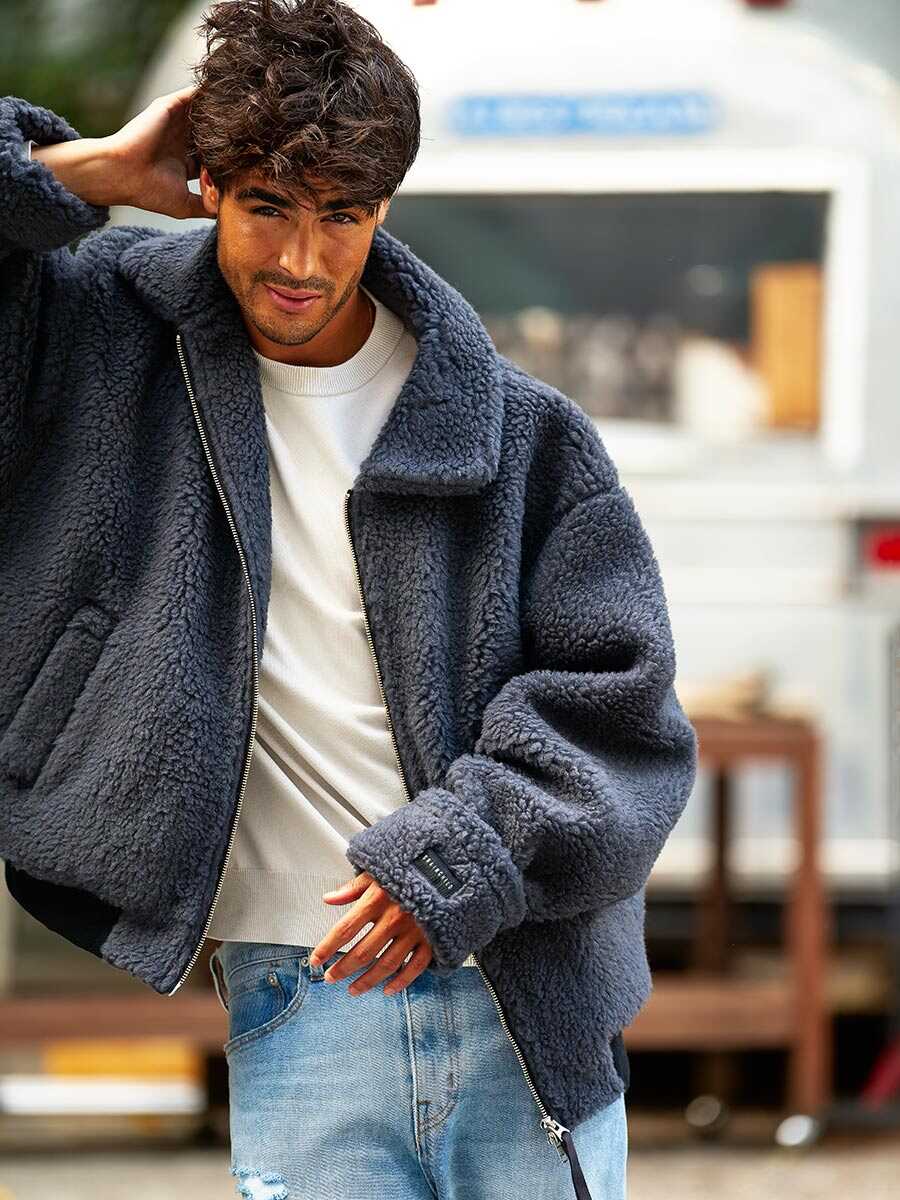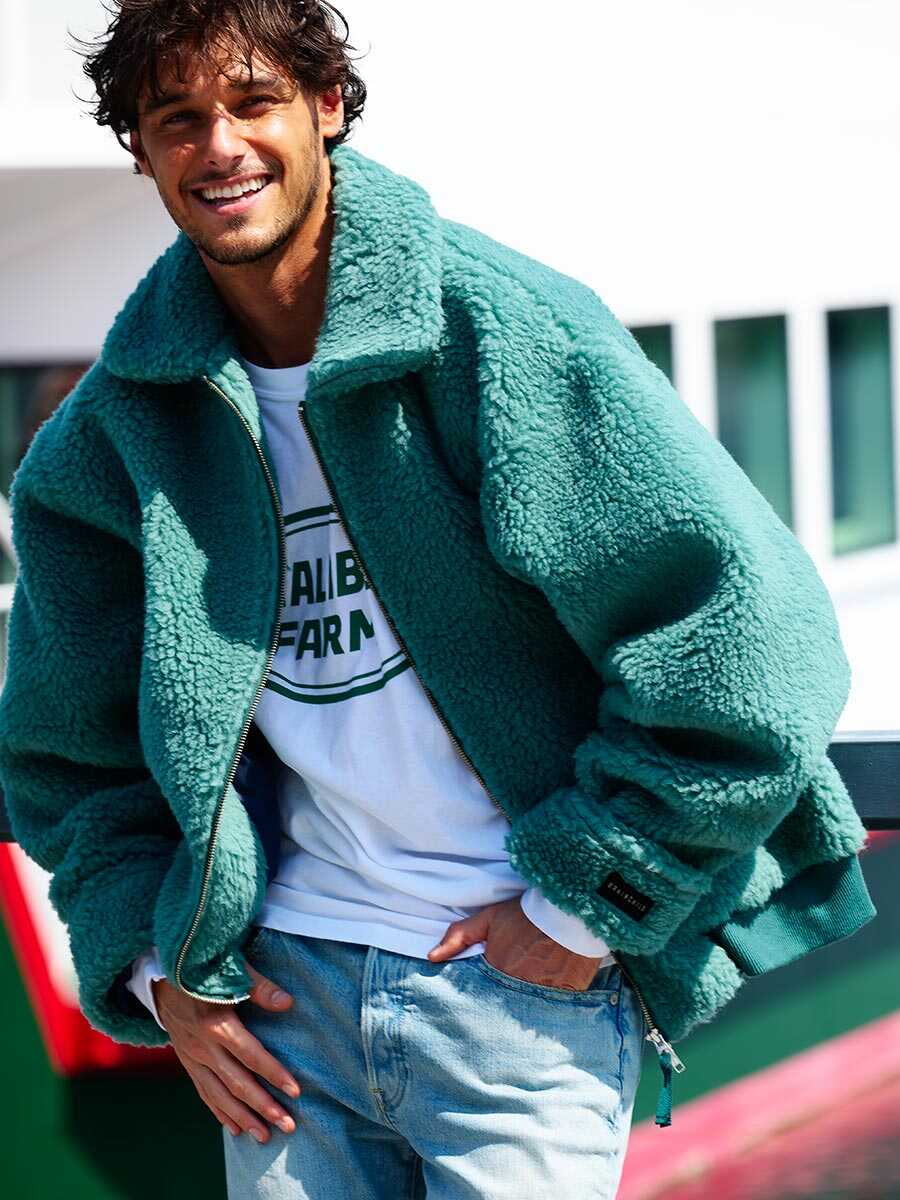 ほっこりとした気分になれる、秋冬のコーディネートに欠かせない、ふわもこなウールボア生地のジャケット。シープスキンジャケットのように高級感あふれる風合いにこだわったアイテム。毛並み部分はウール100%、グラウンド基布はリサイクルポリエステル100%で、裏地にはしなやかなツイル生地を採用。裾にはアクセントとして、ディアスキンの革紐を裾に取り付けたり、左袖口にロゴ入りのタグを配しているのがポイントだ。